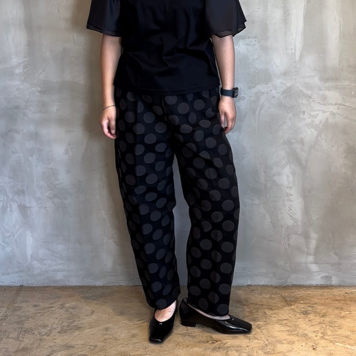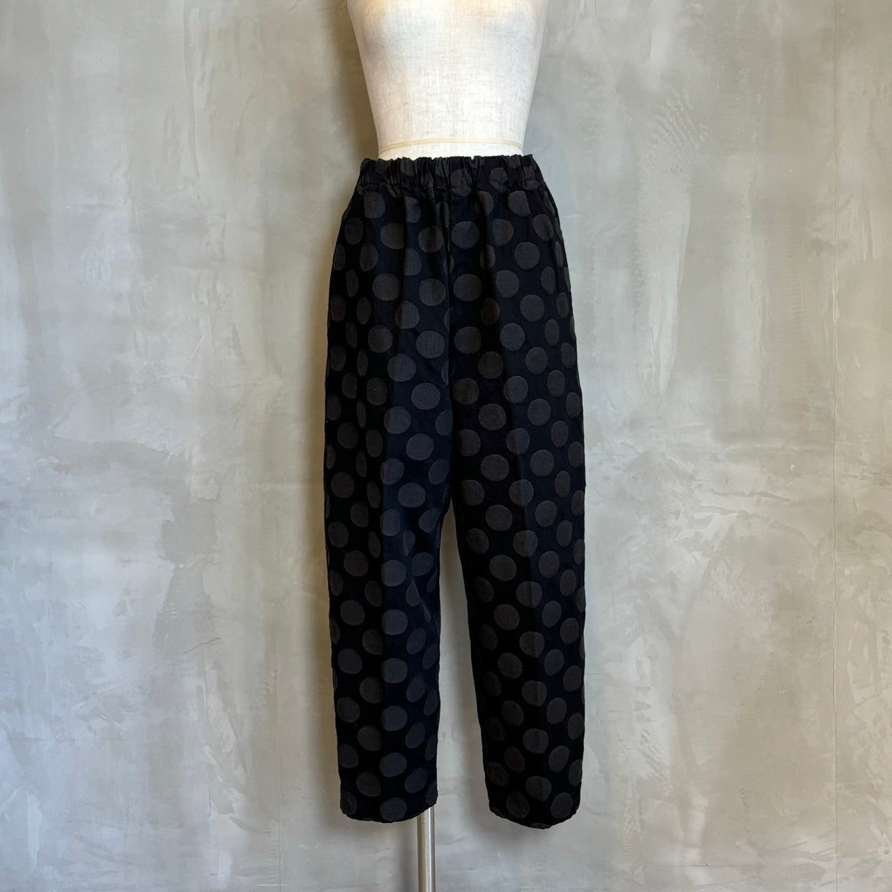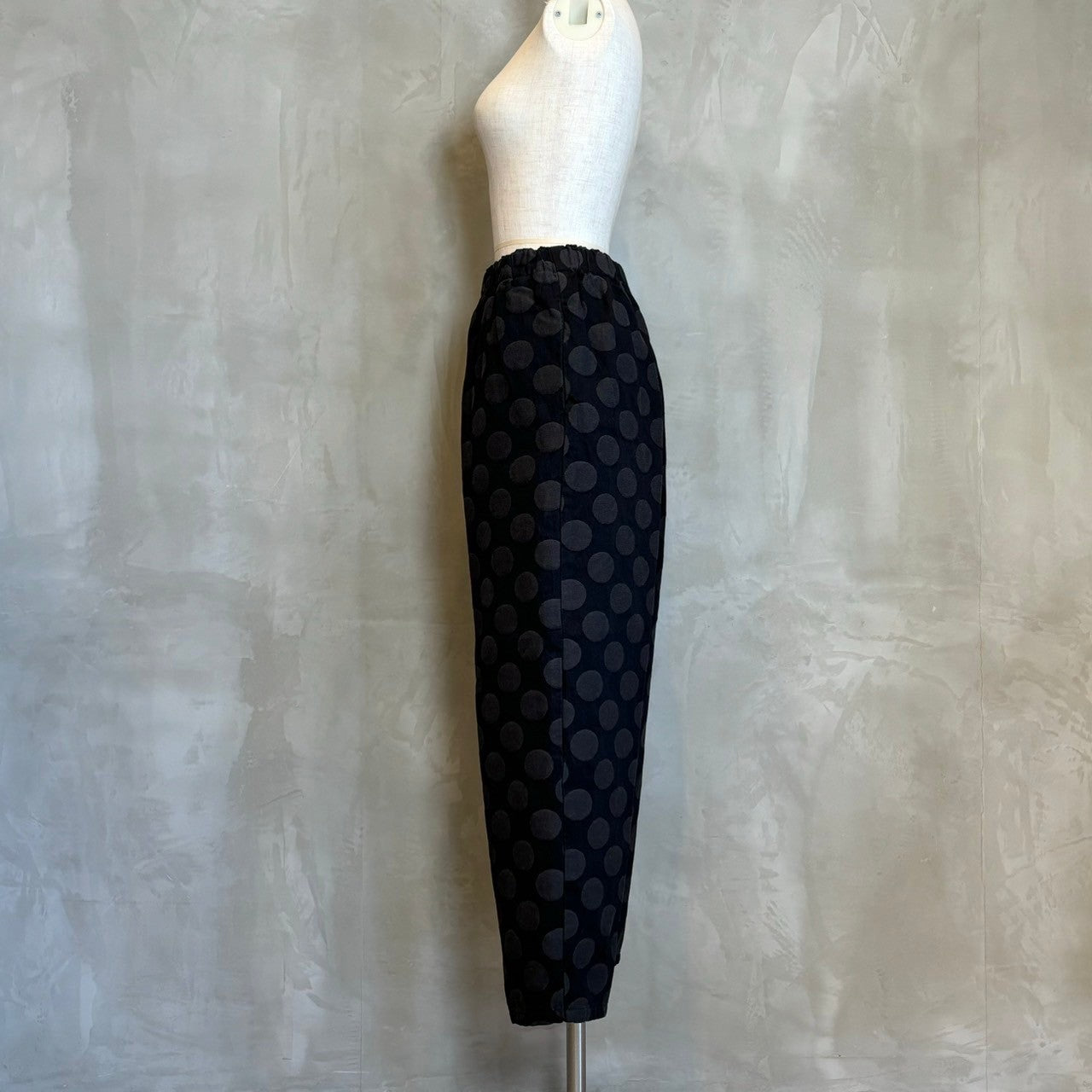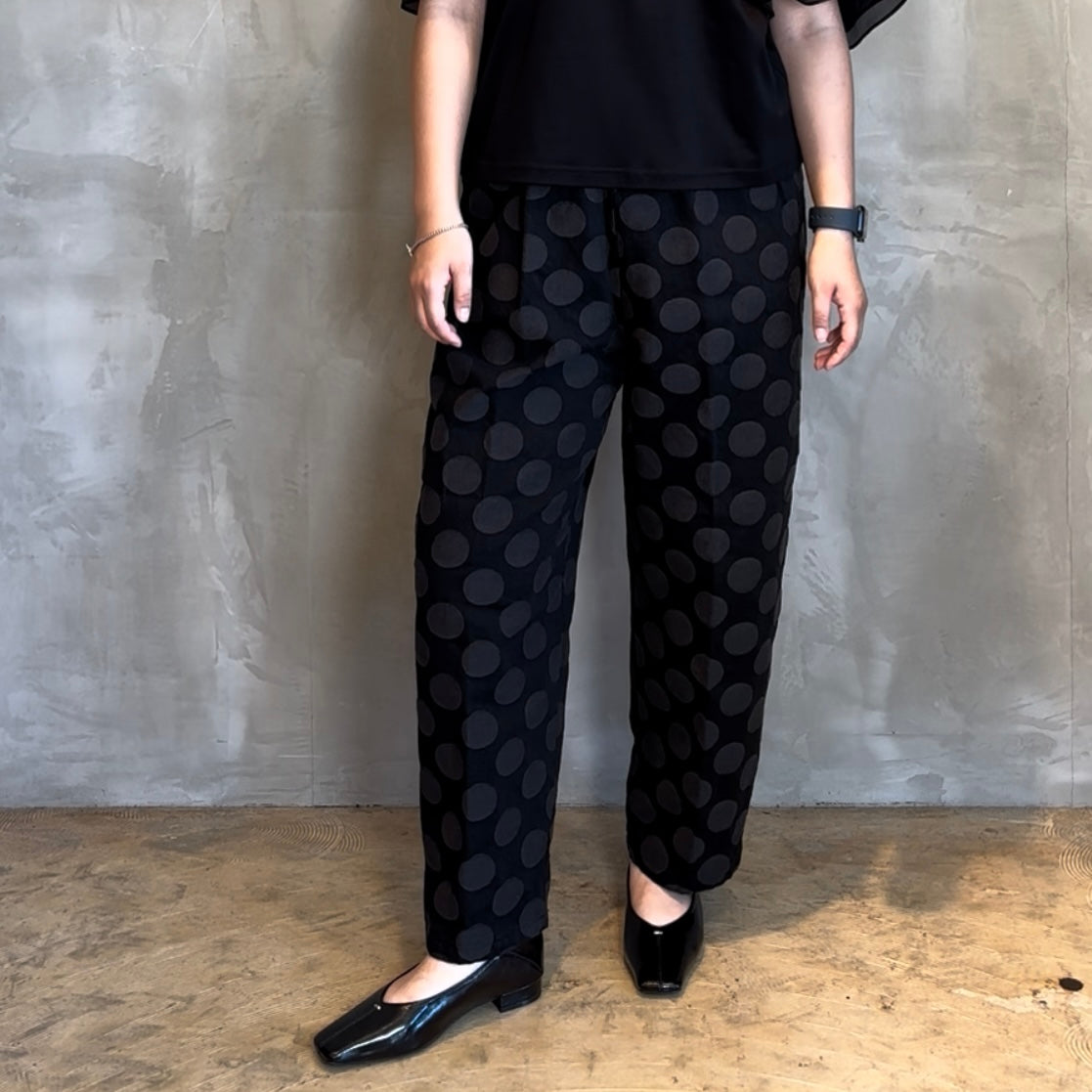 華やかな大きなドット柄が目を引くテーパードシルエットで、スタイリングに一味違うアクセントをプラスします。