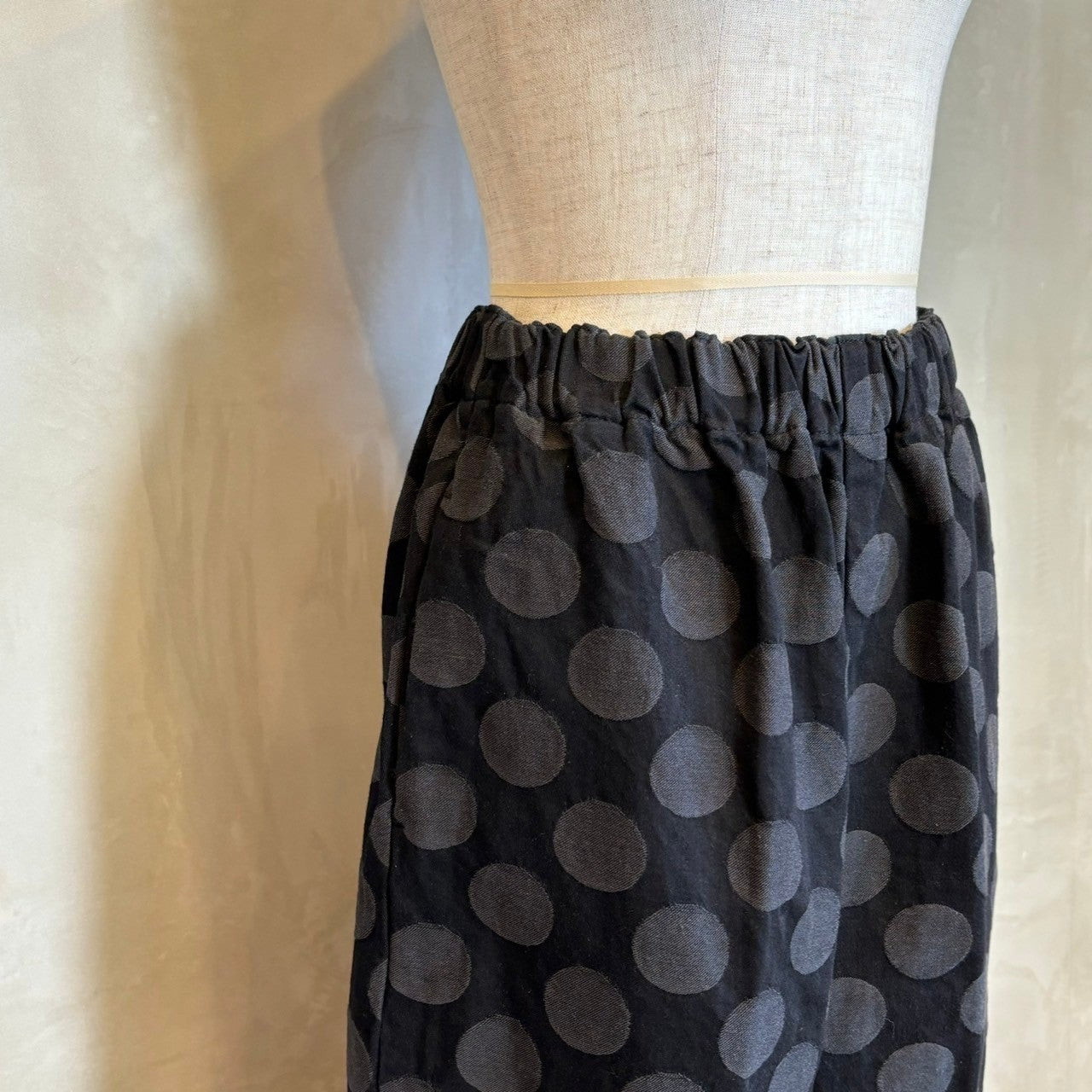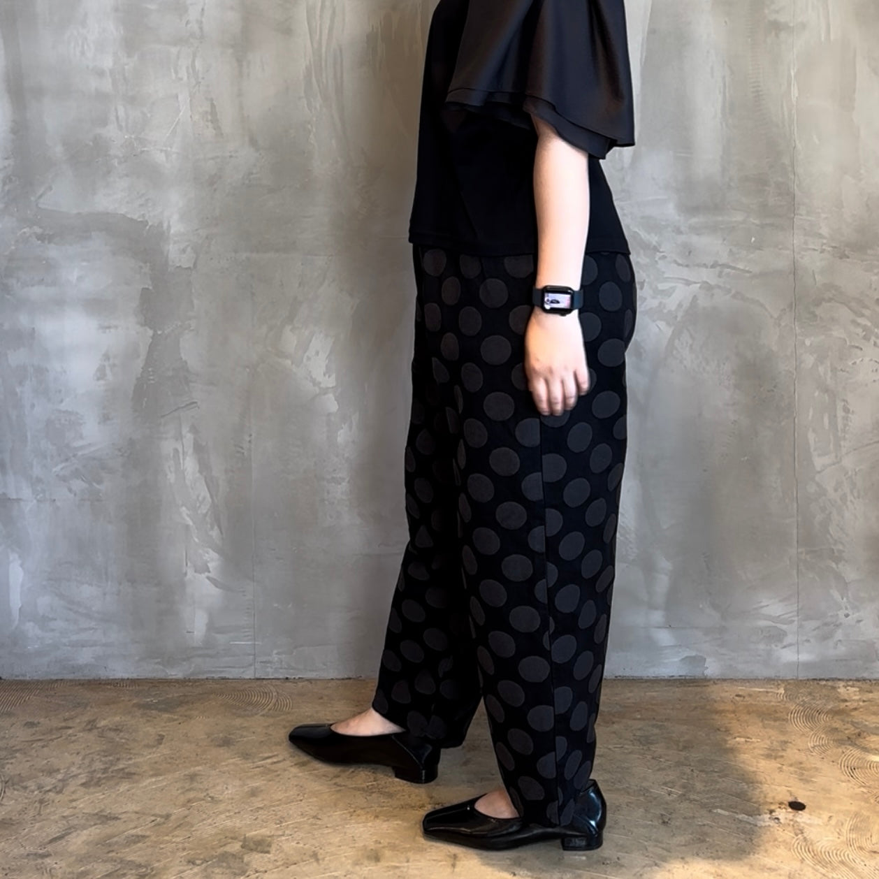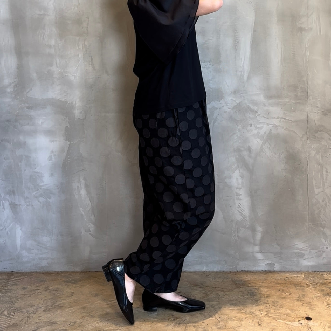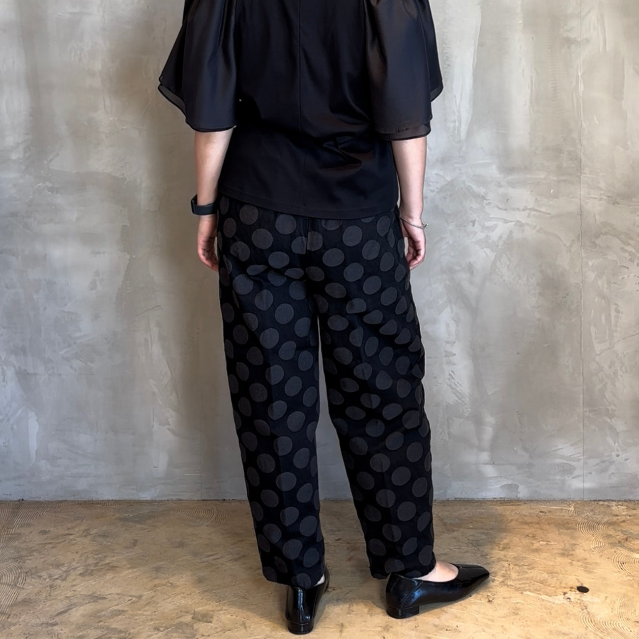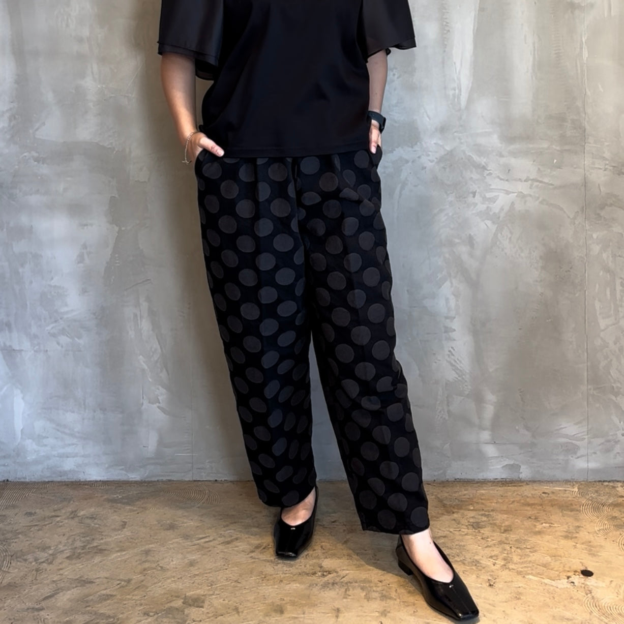 華やかな大きなドット柄が目を引くテーパードシルエットで、スタイリングに一味違うアクセントをプラスします。