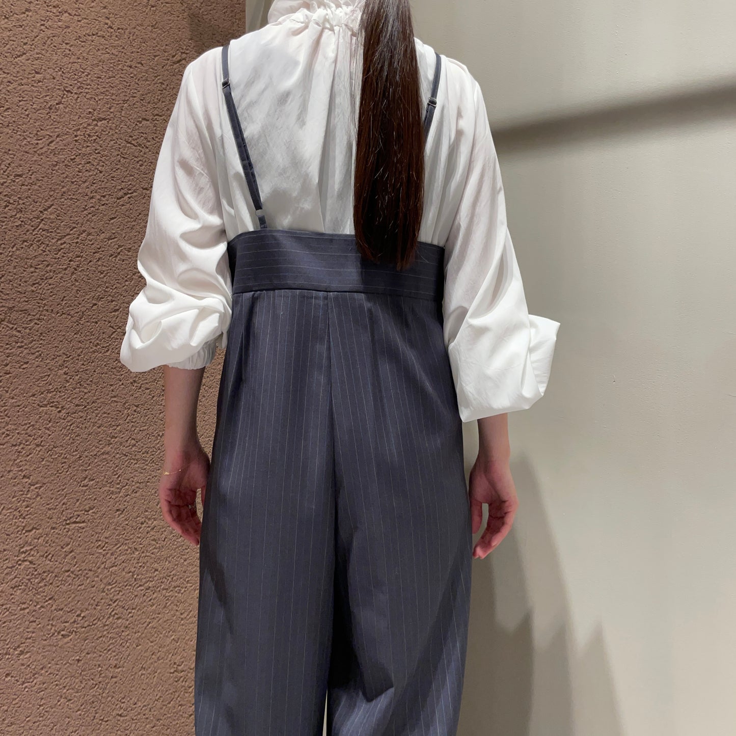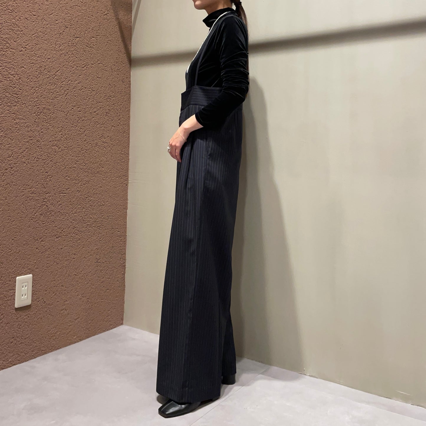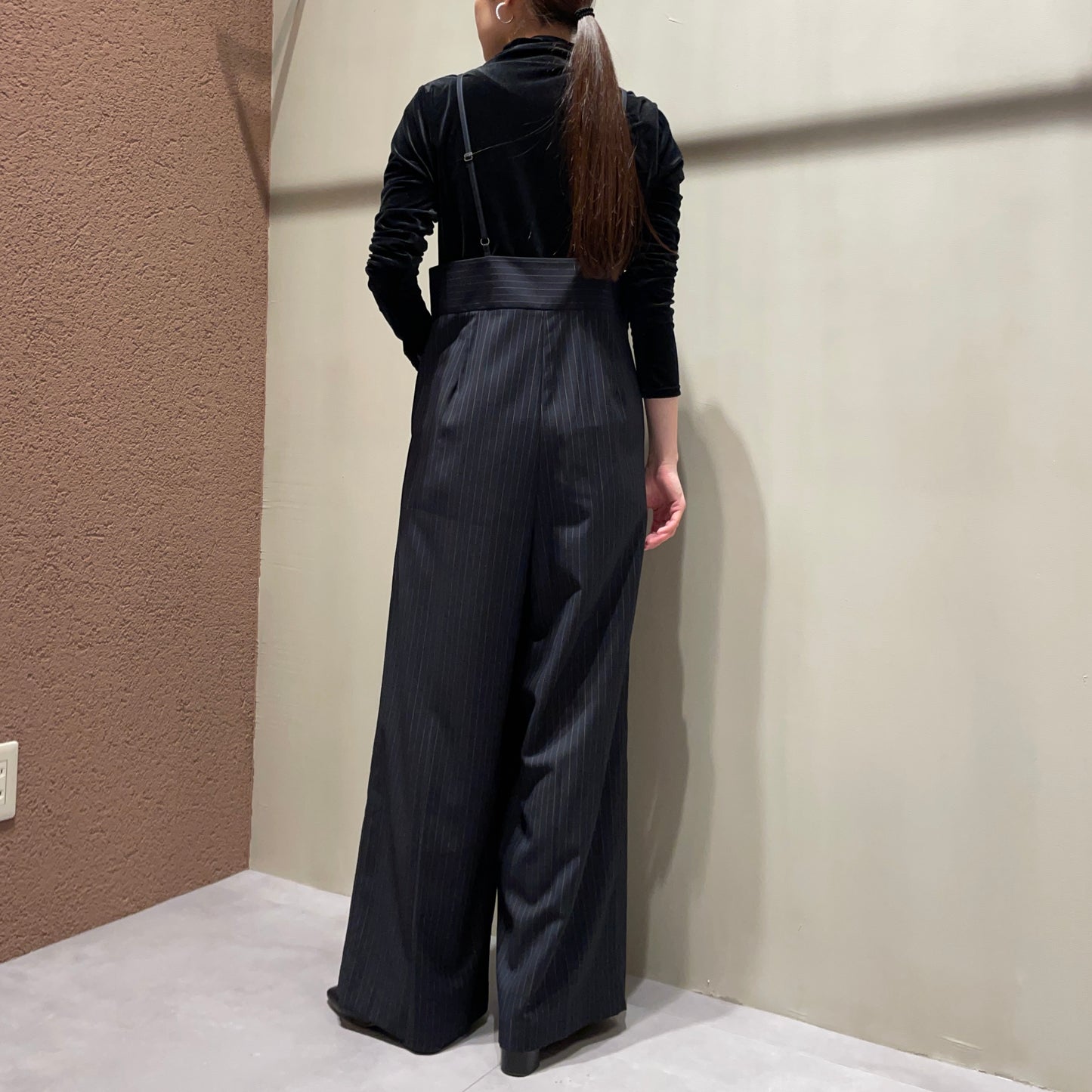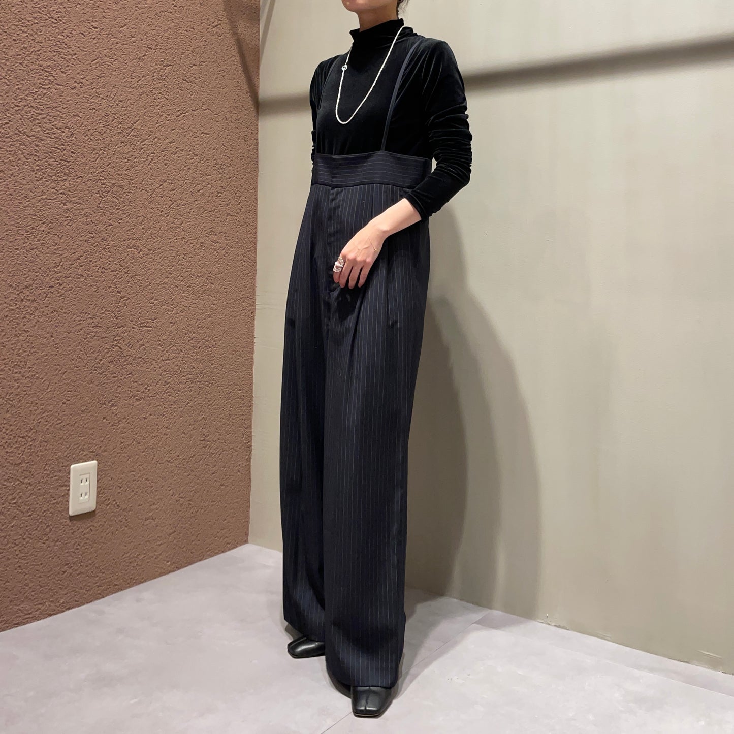 【anana】ストライプ細サスペンダーワイドパンツ