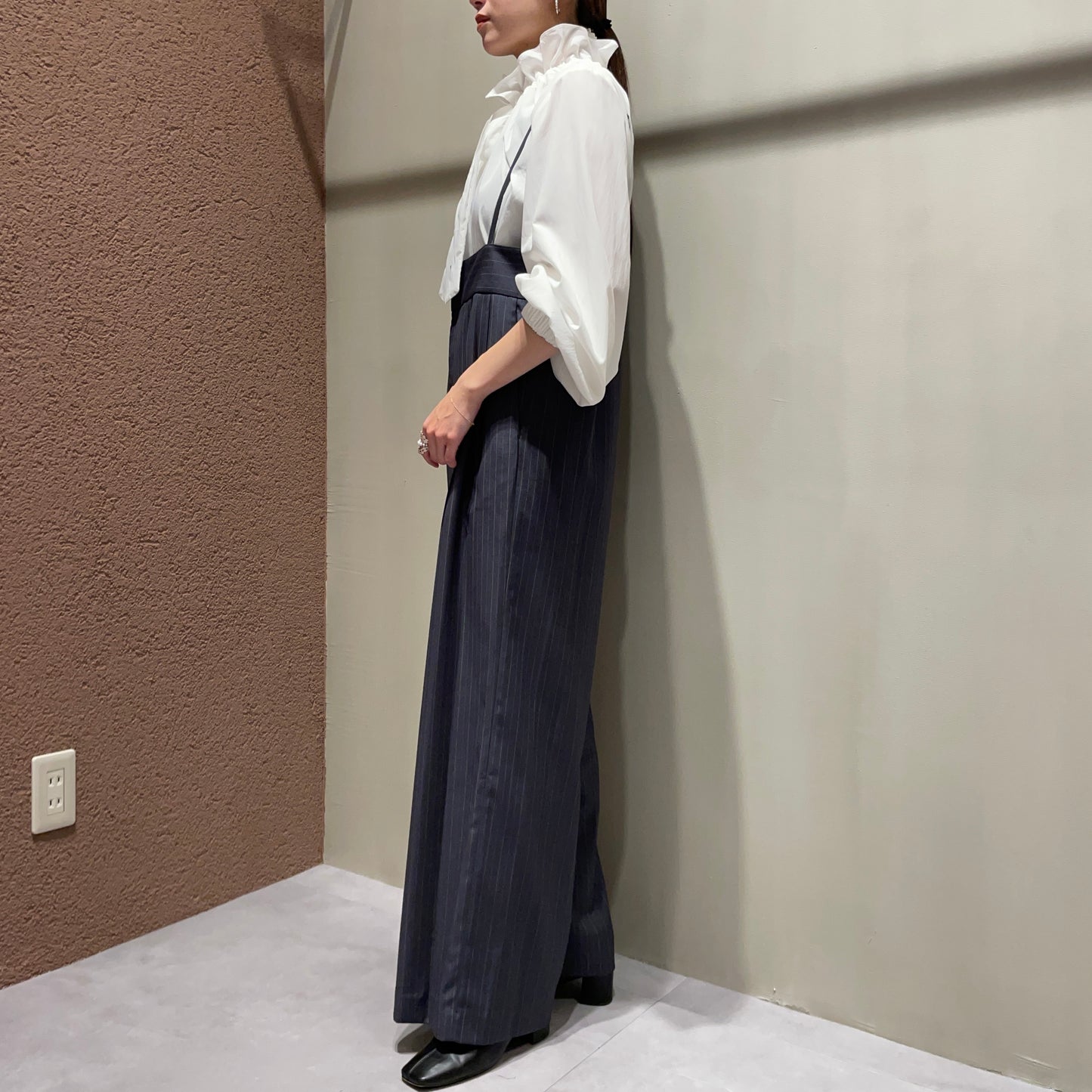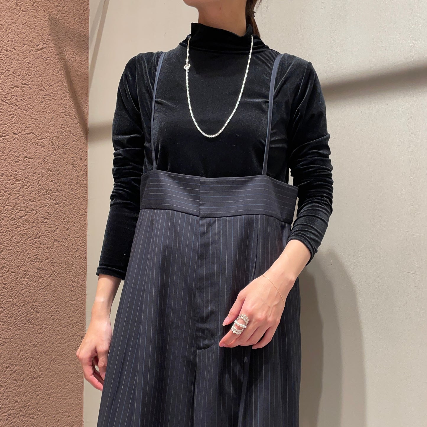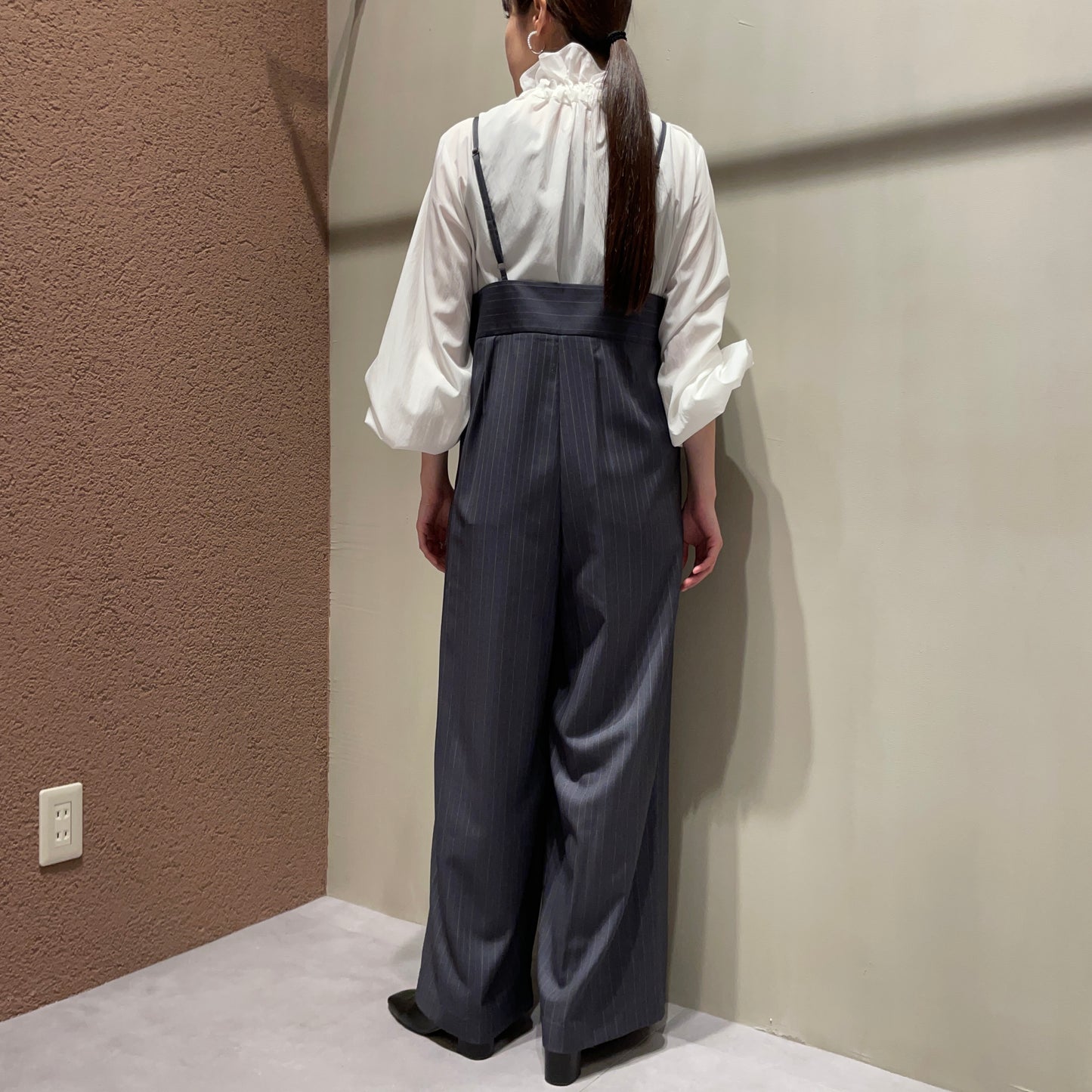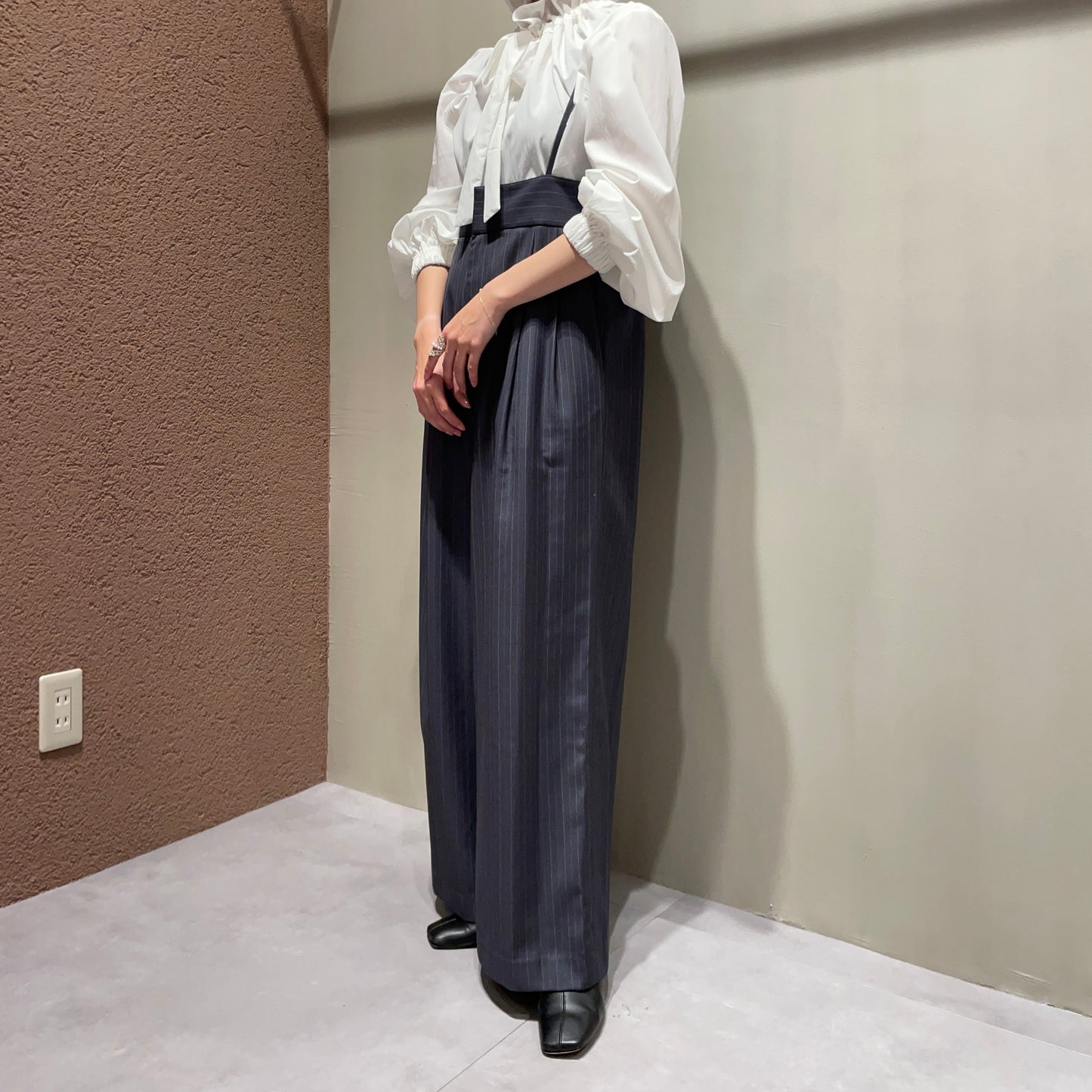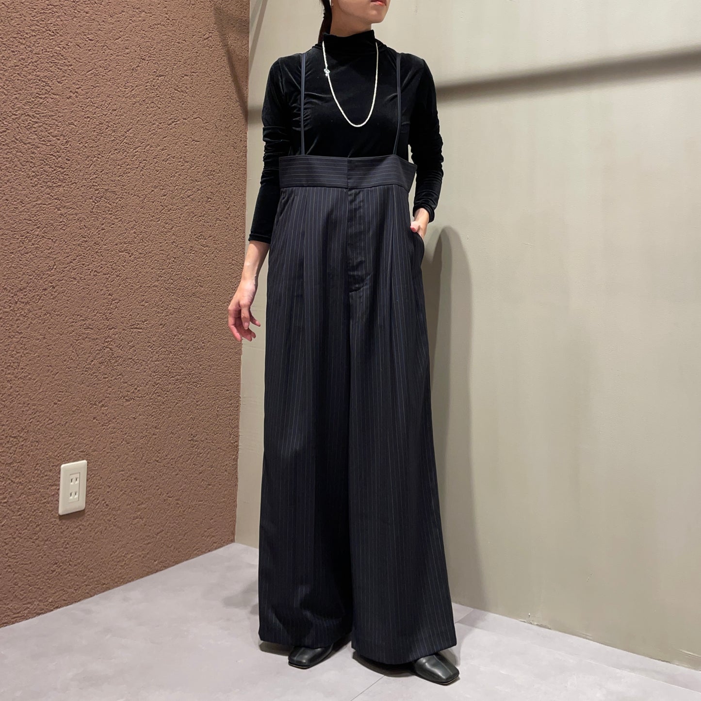 【anana】ストライプ細サスペンダーワイドパンツ