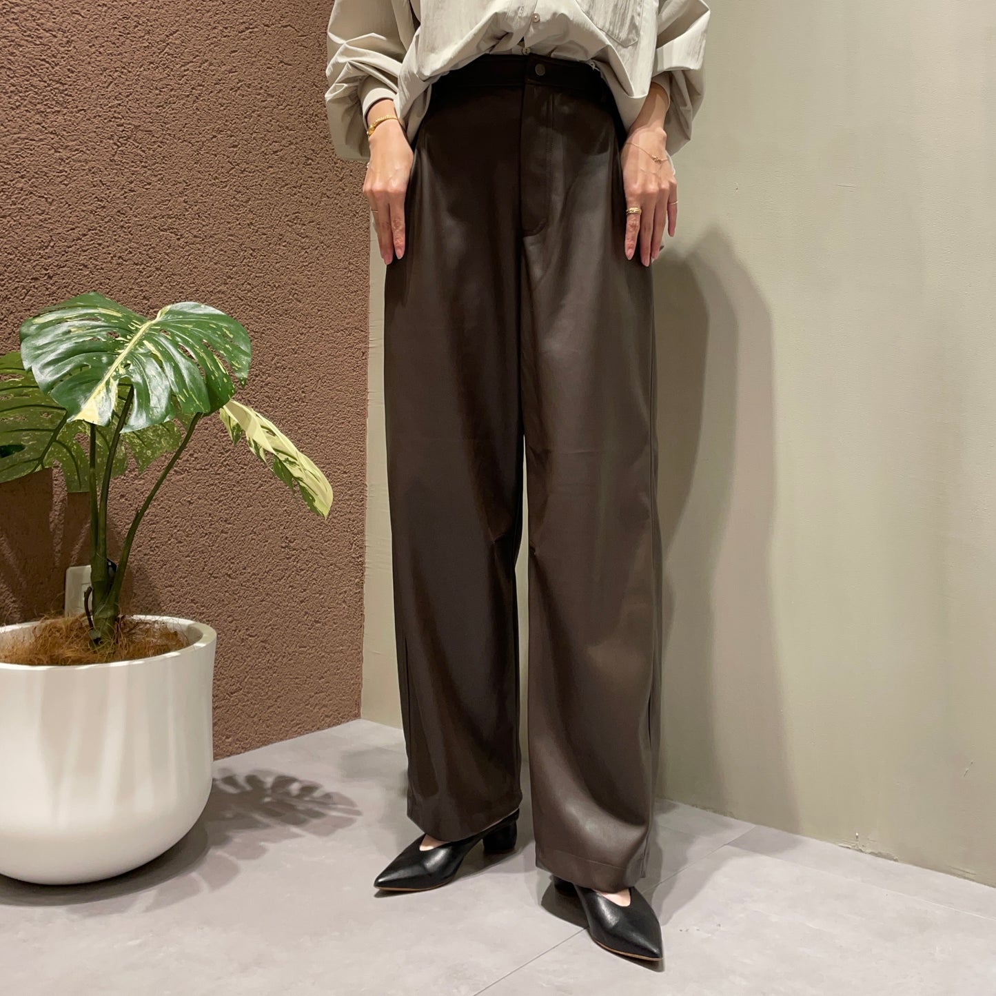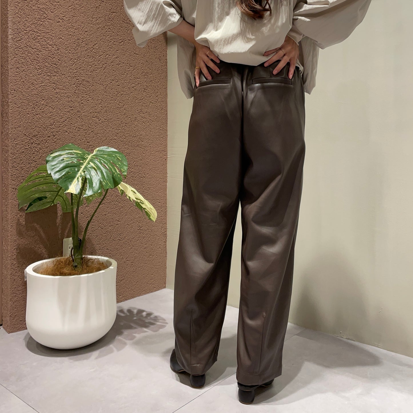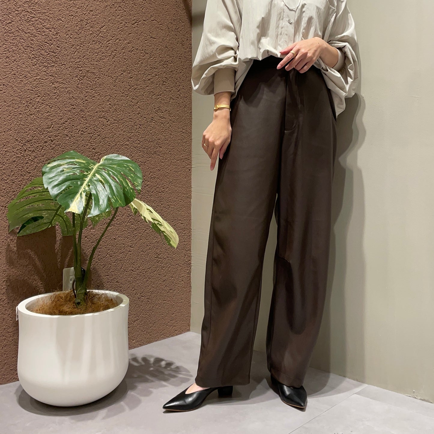 ストレッチ性のあるフェイクレザーを採用したバレルパンツ。