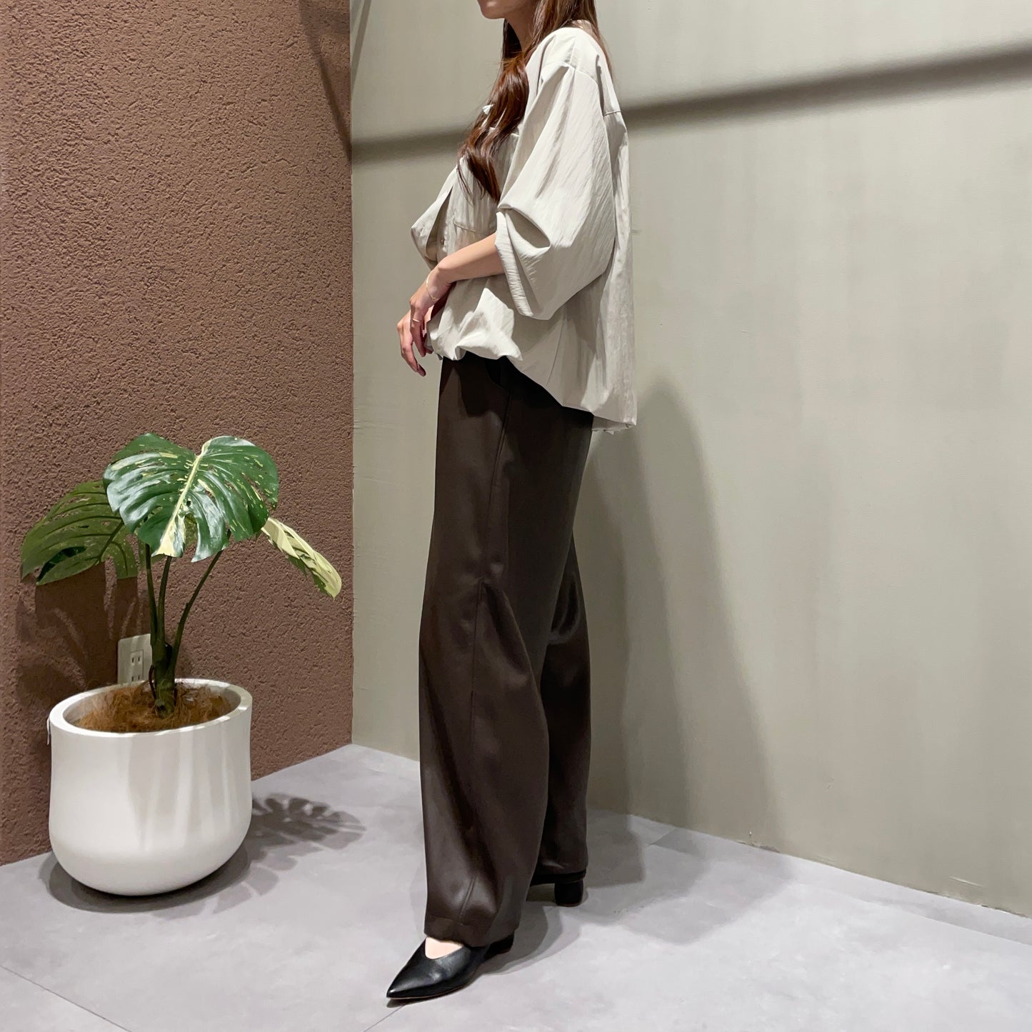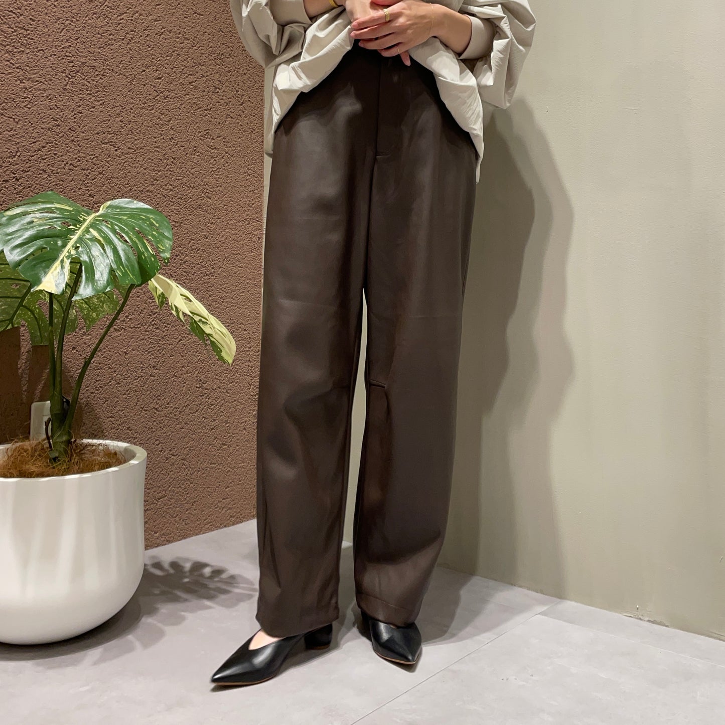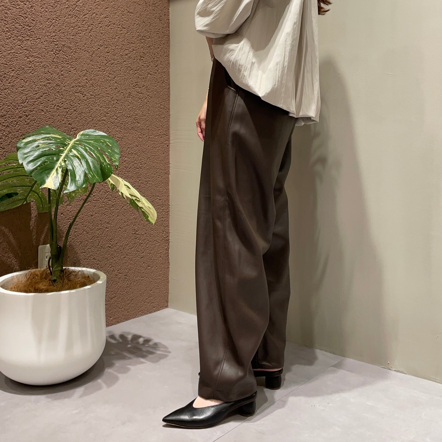 ストレッチ性のあるフェイクレザーを採用したバレルパンツ。