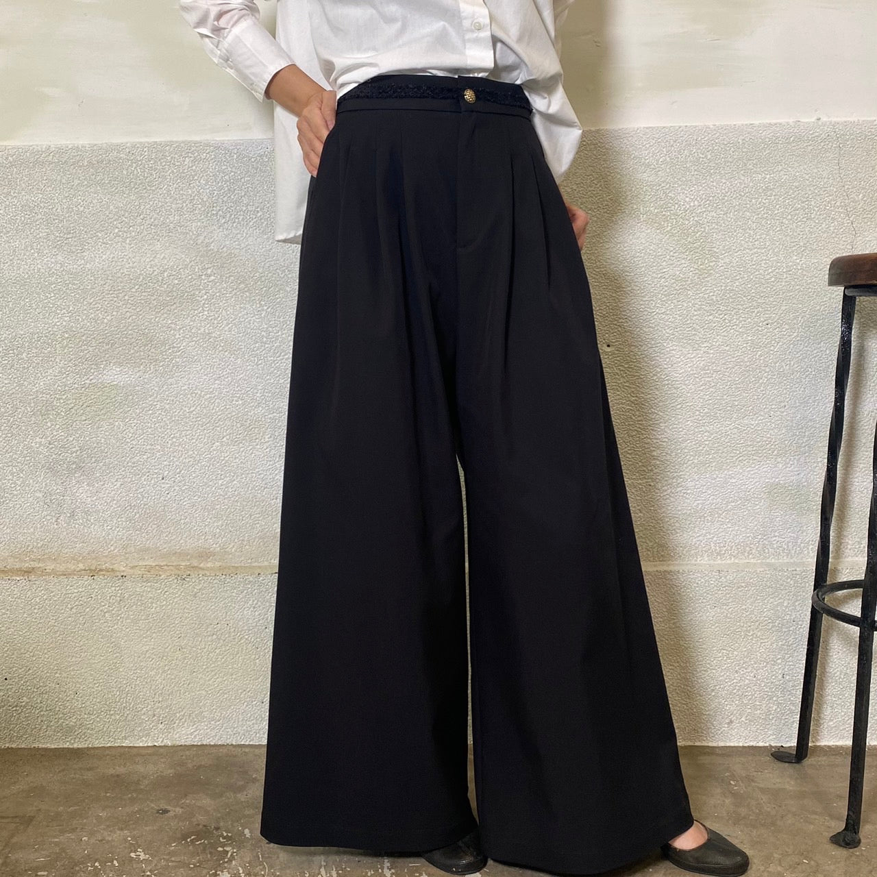 ウエスト後ろ部分がゴム仕様なので、着心地の良さも兼ね備えています。