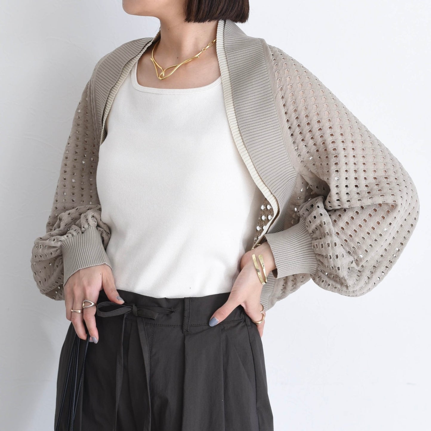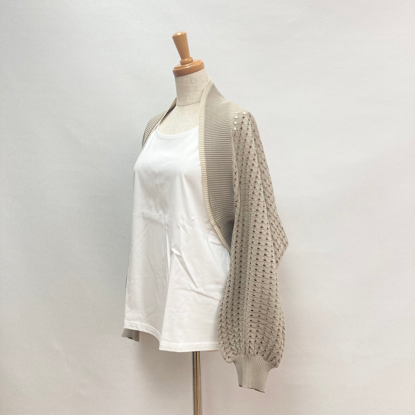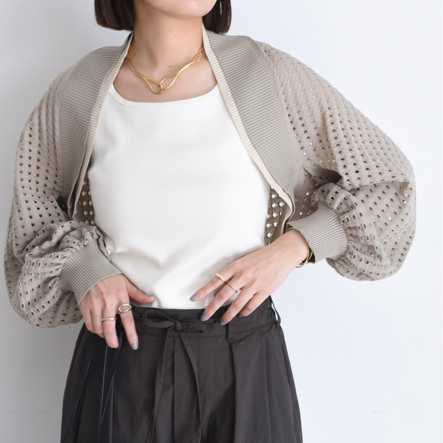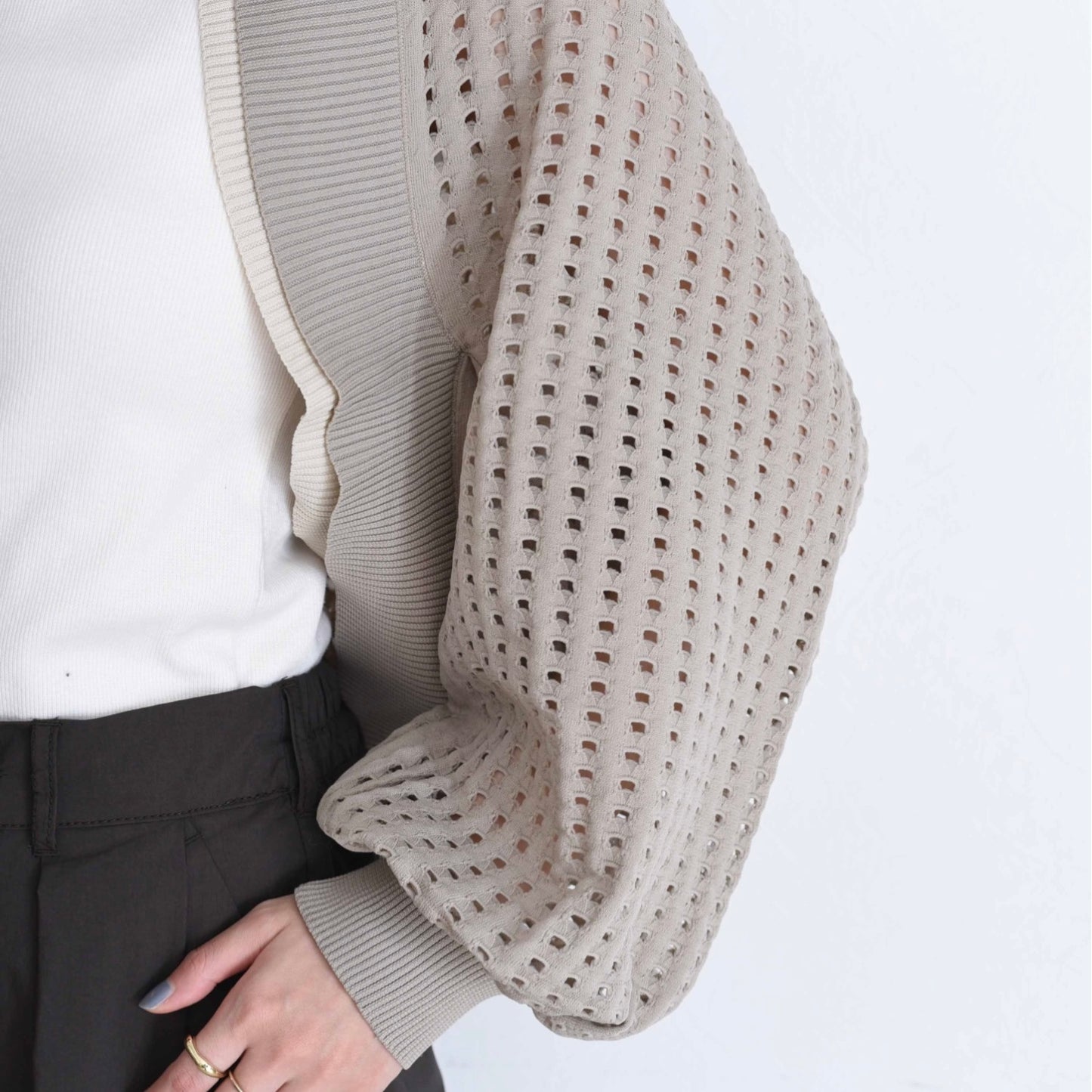 膨らみのあるスポンジングな糸で仕上げたメッシュニットボレロ。