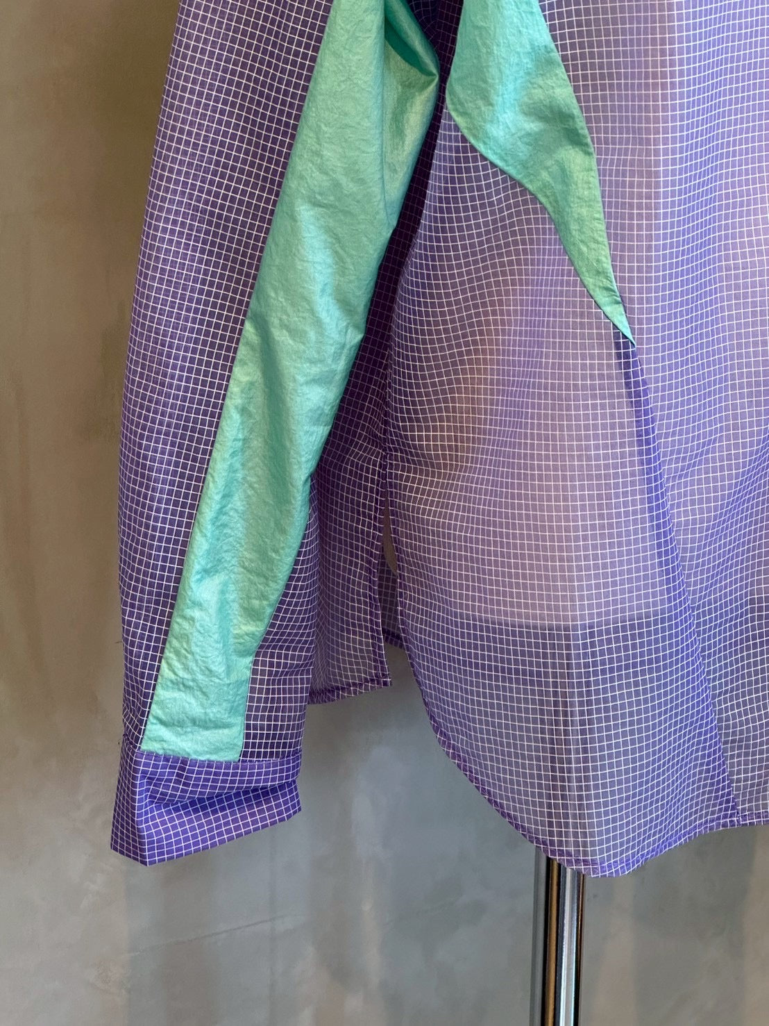 サイドには光沢感のある生地を切り替え、透け感とツヤ感のコントラストでスタイリングに奥行きをプラス。