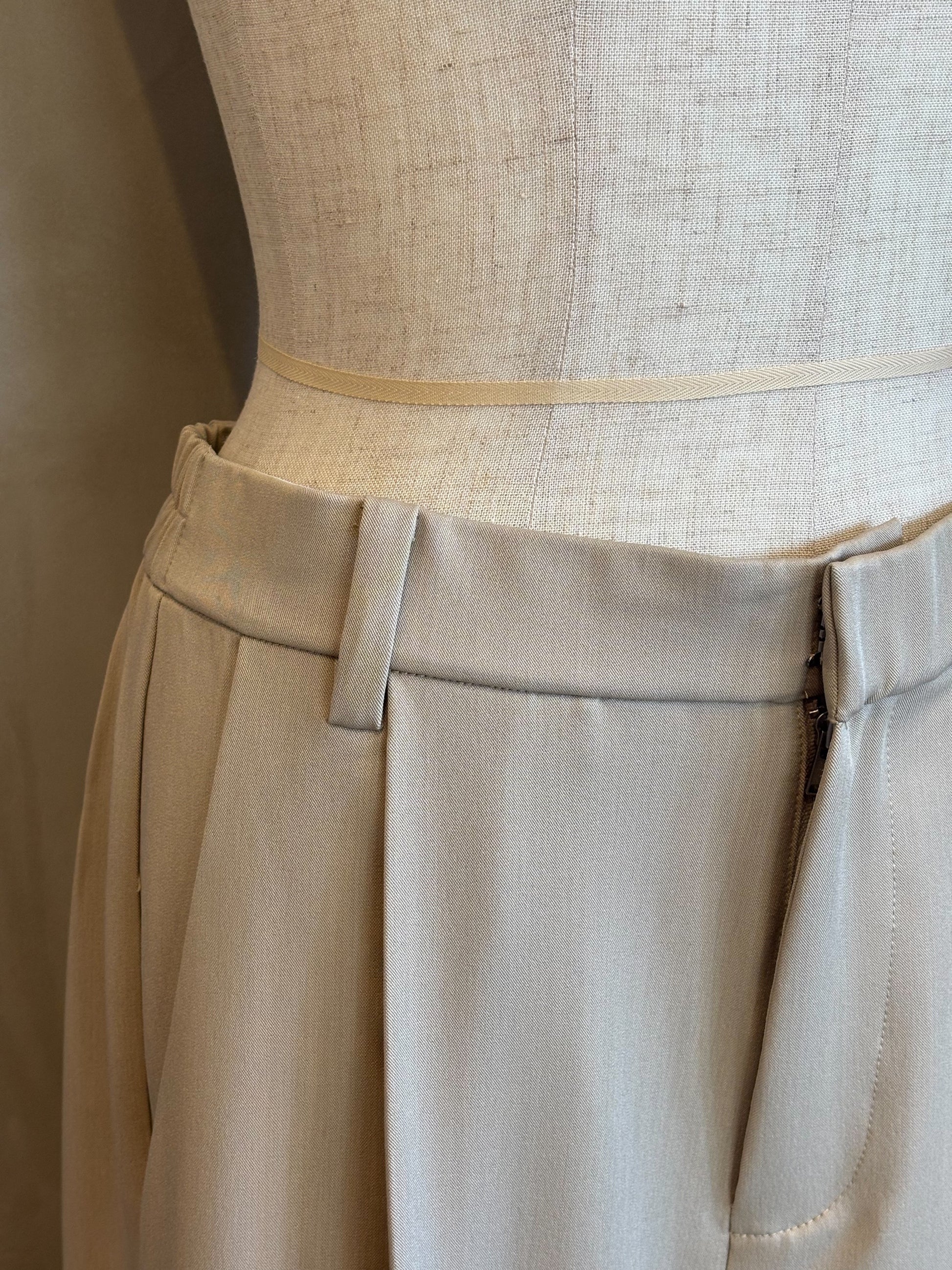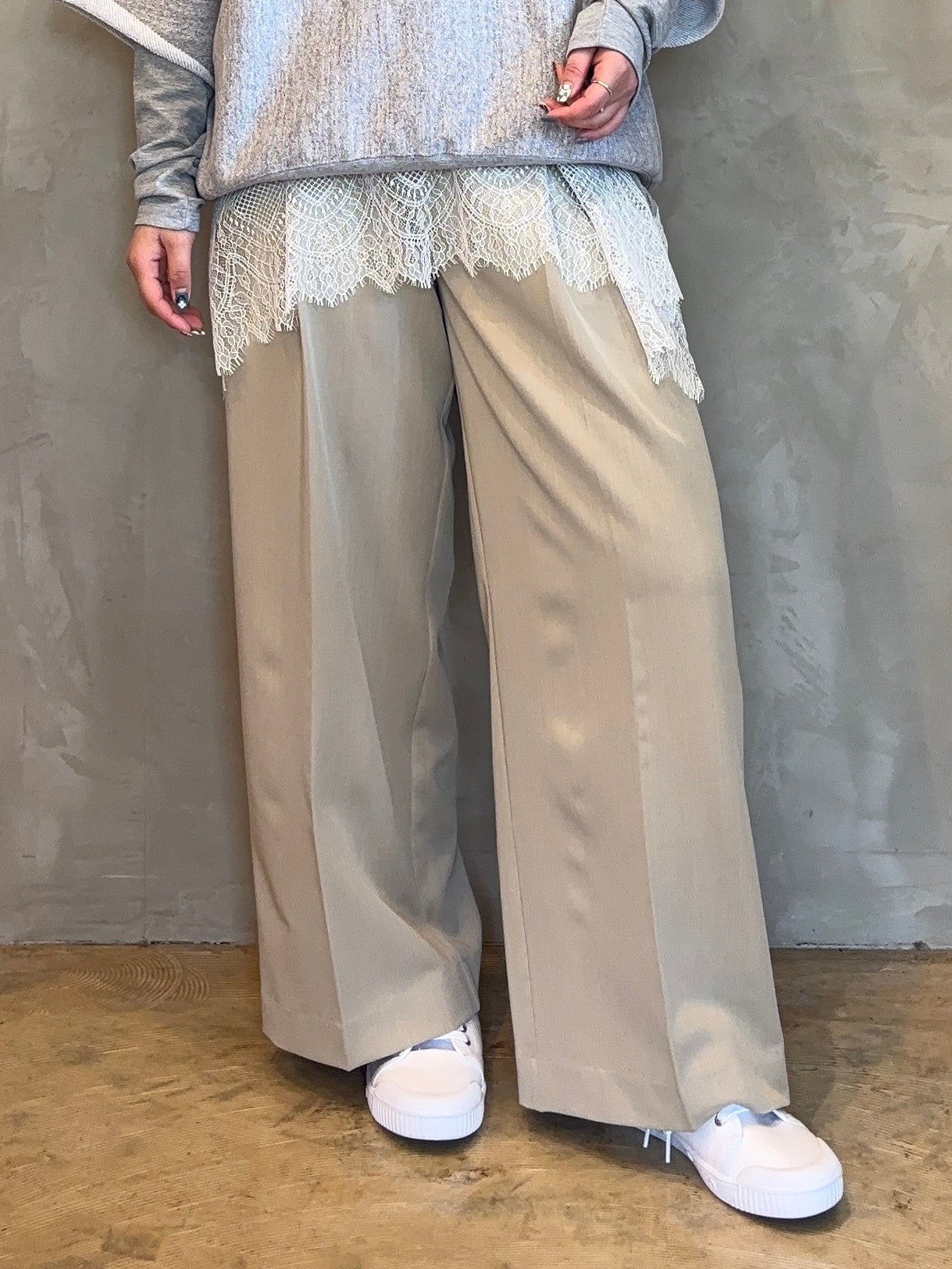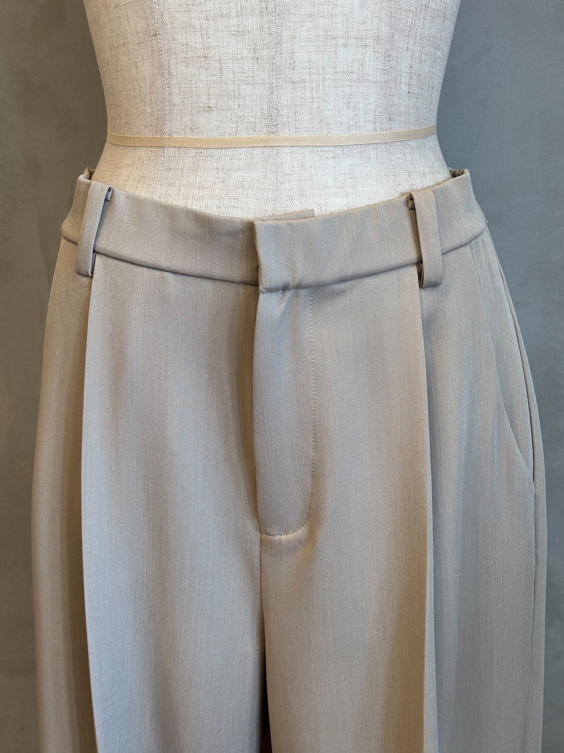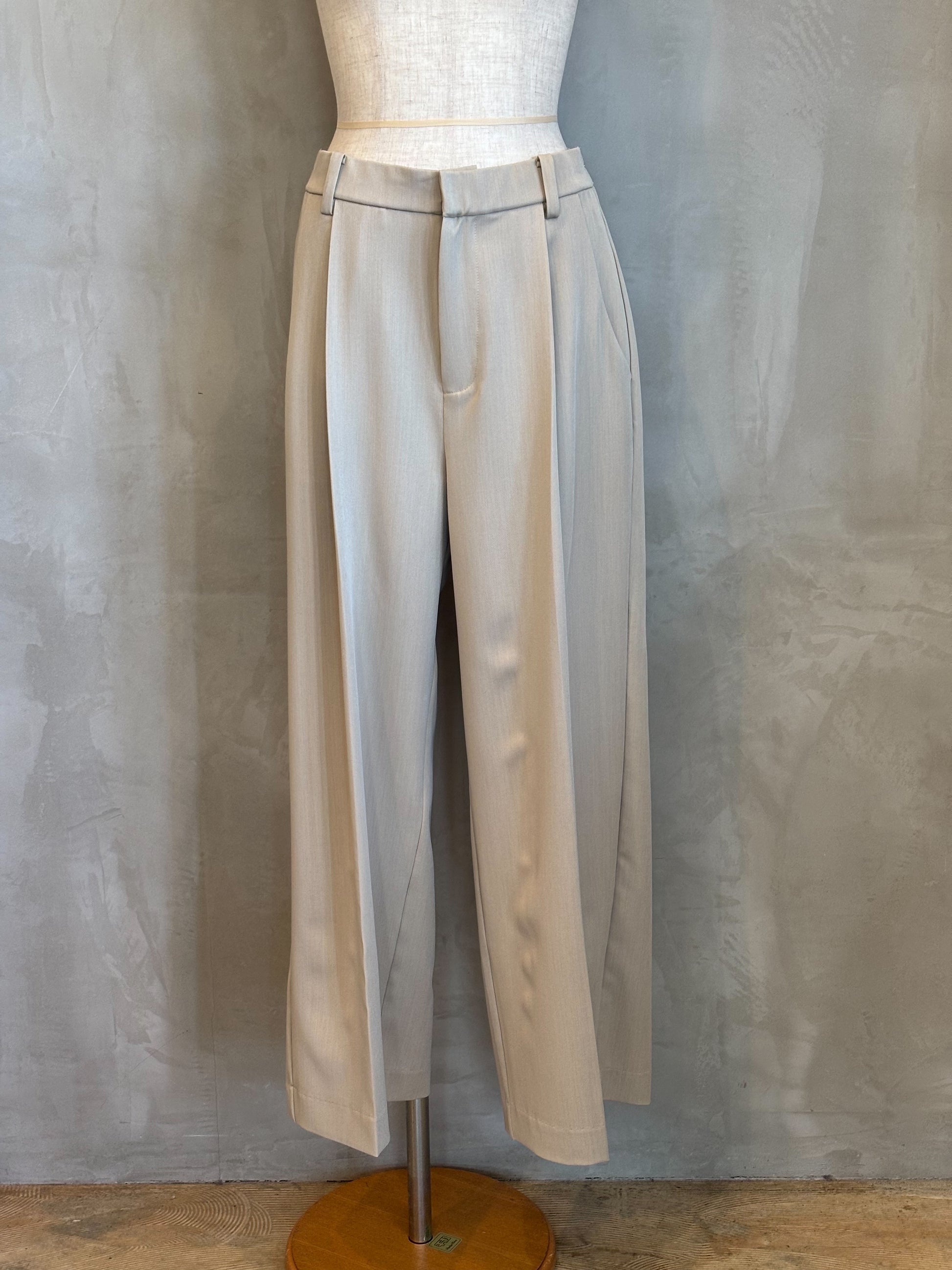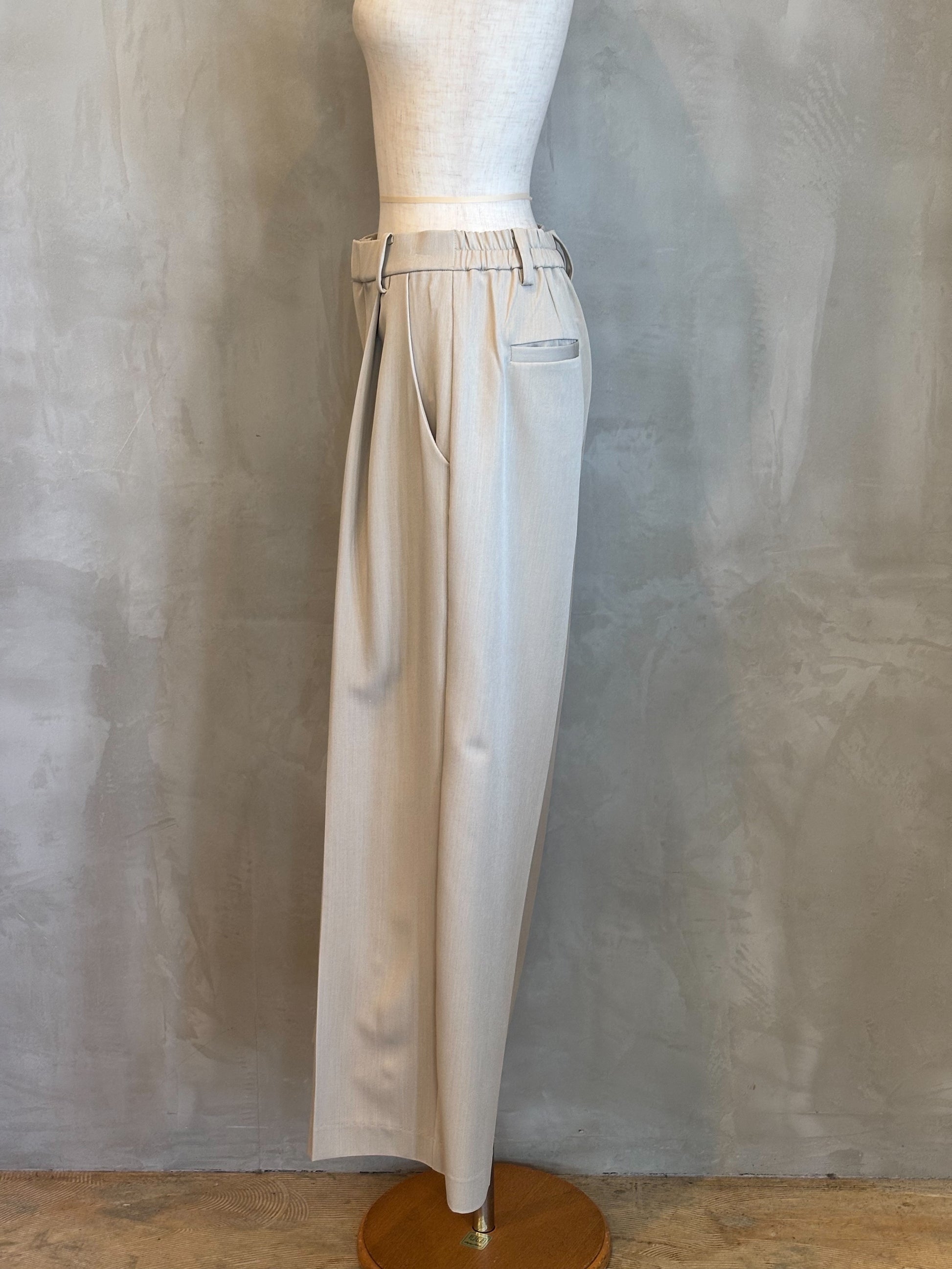 腰周りにゆとりを持たせたタック入りのワイドパンツ。
