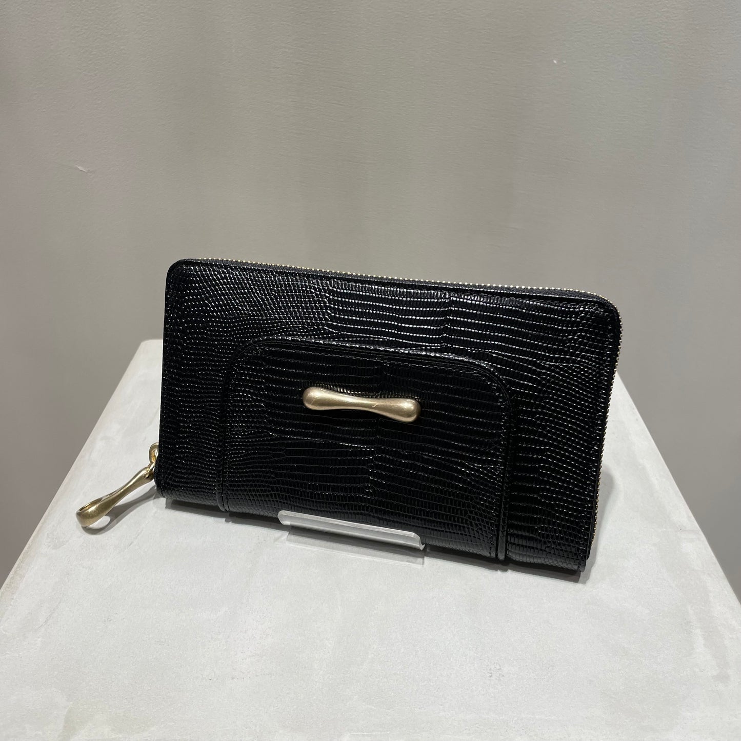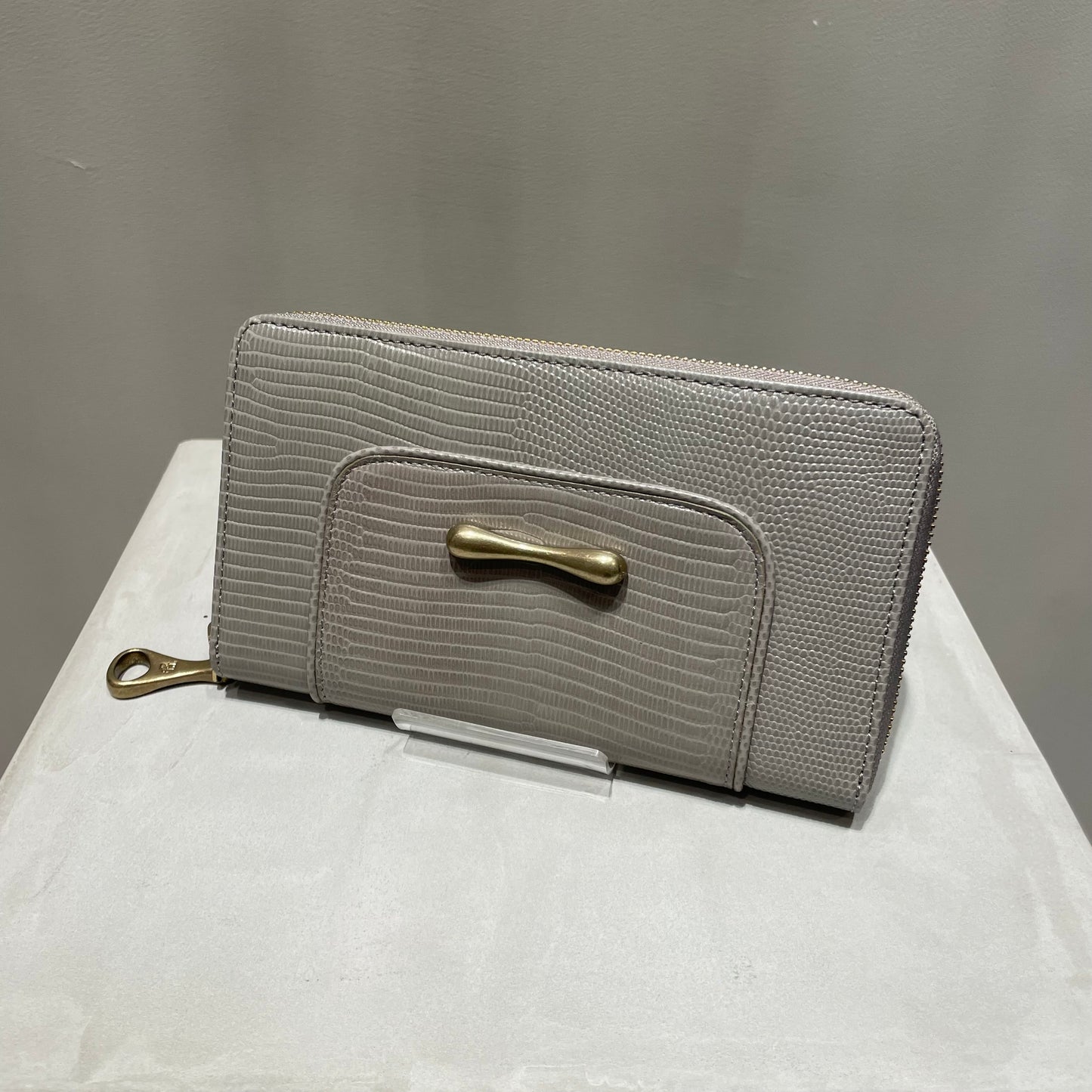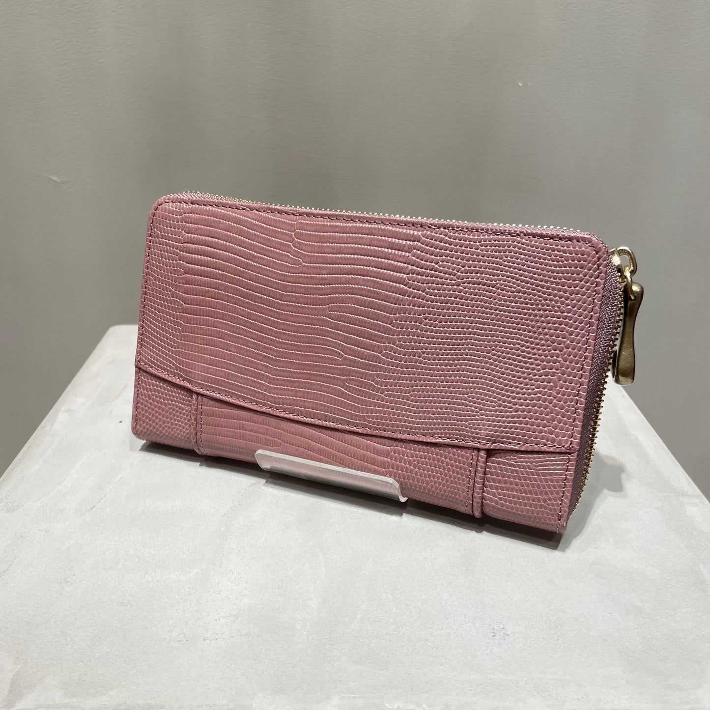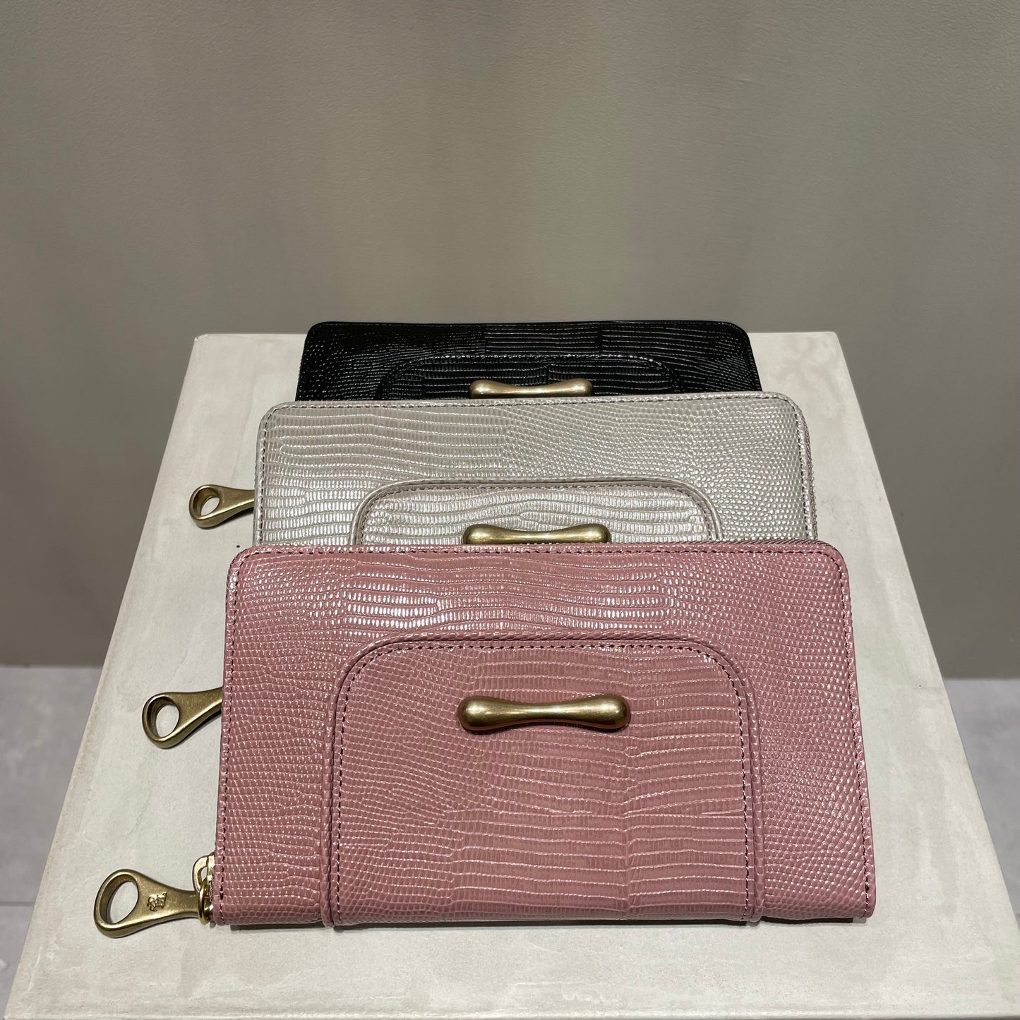 豊かな表情が魅力のリザードの型押し革は、染色をしたあとに、手塗りで調整をしながら陰影をつけていき、さらに上から透明なフィルムをラミネートするという手間のかかった素材です。