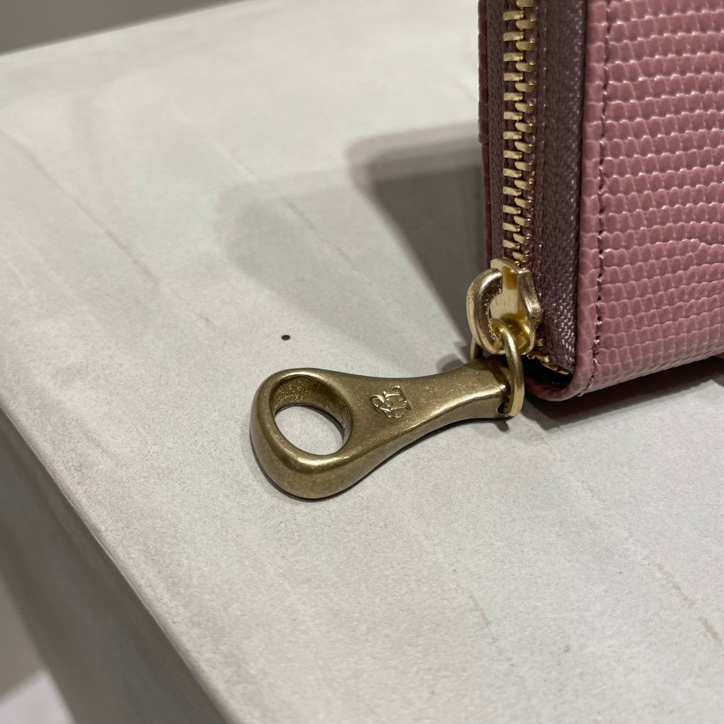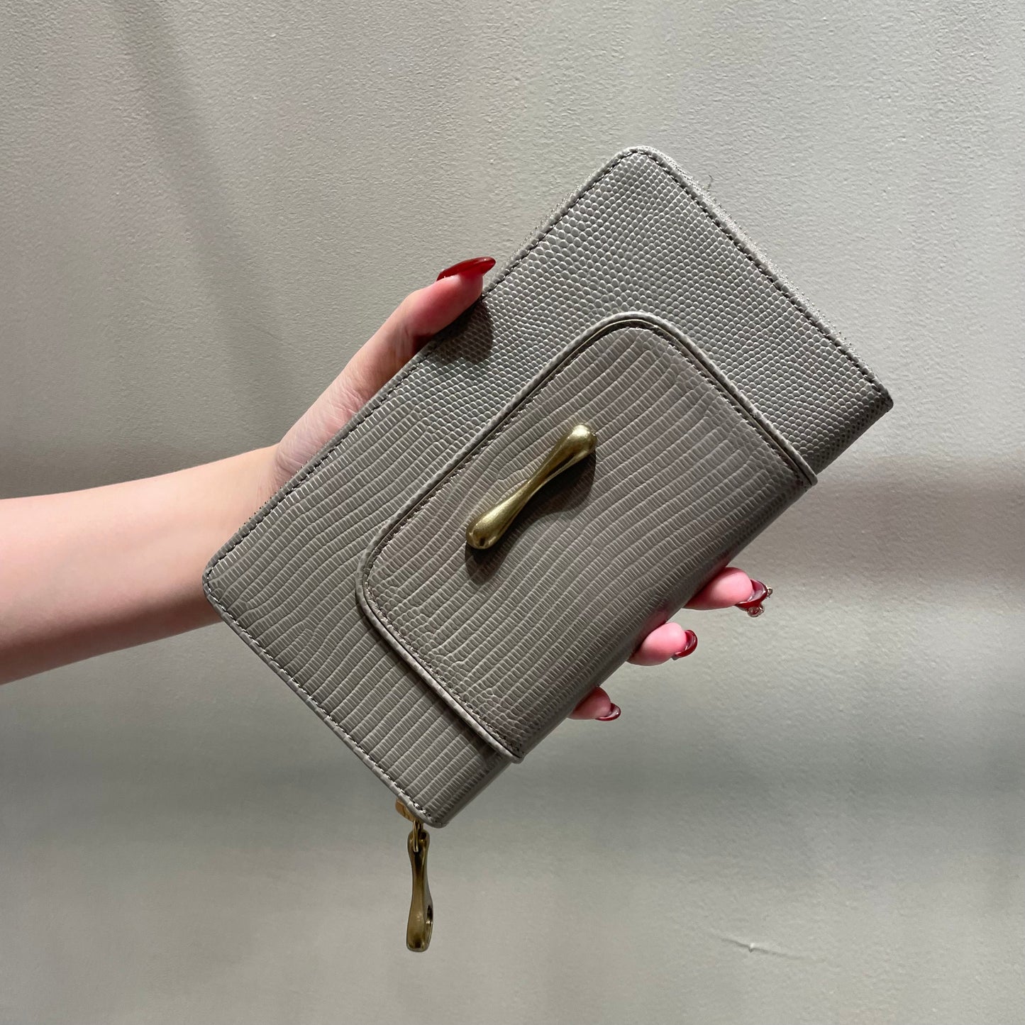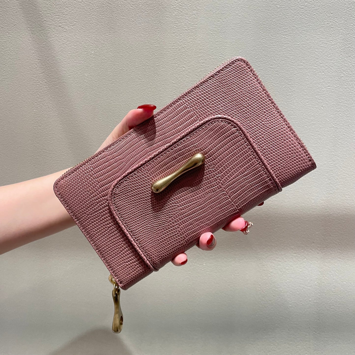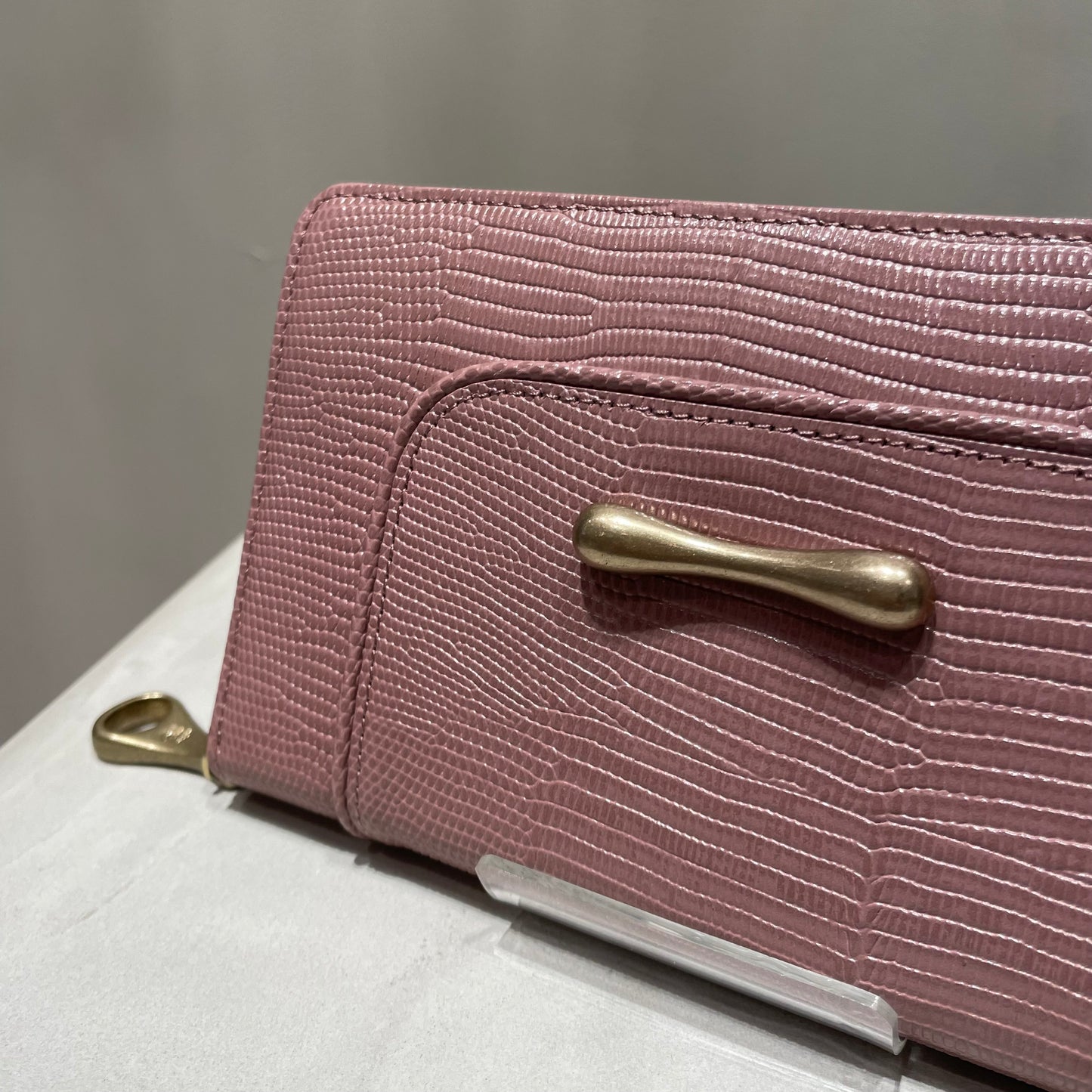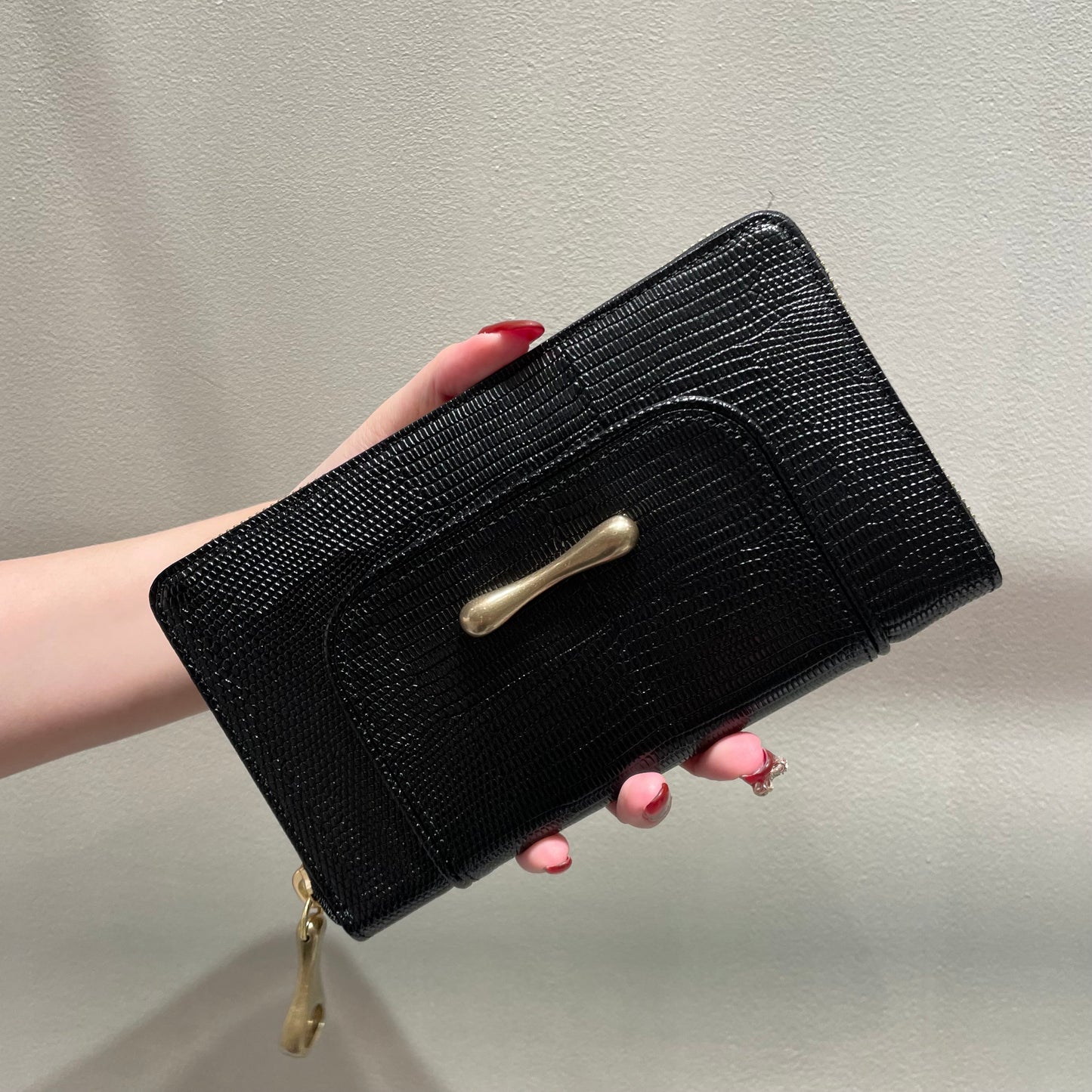 豊かな表情が魅力のリザードの型押し革は、染色をしたあとに、手塗りで調整をしながら陰影をつけていき、さらに上から透明なフィルムをラミネートするという手間のかかった素材です。