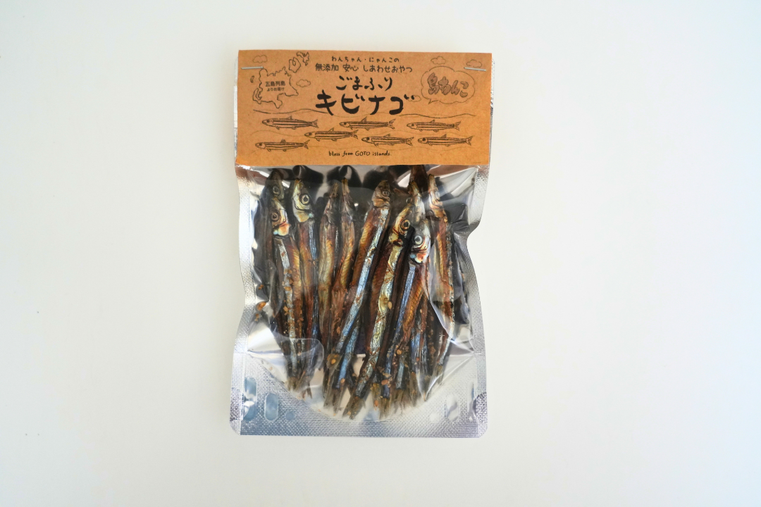 【ごまキビナ】五島でとれた新鮮なキビナゴに卵白を付けてごまをまぶし、香ばしく仕上げた商品です。人も一緒に食べられて栄養価も高く、おやつにも人気の商品です。