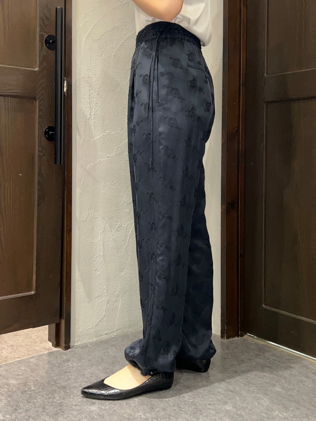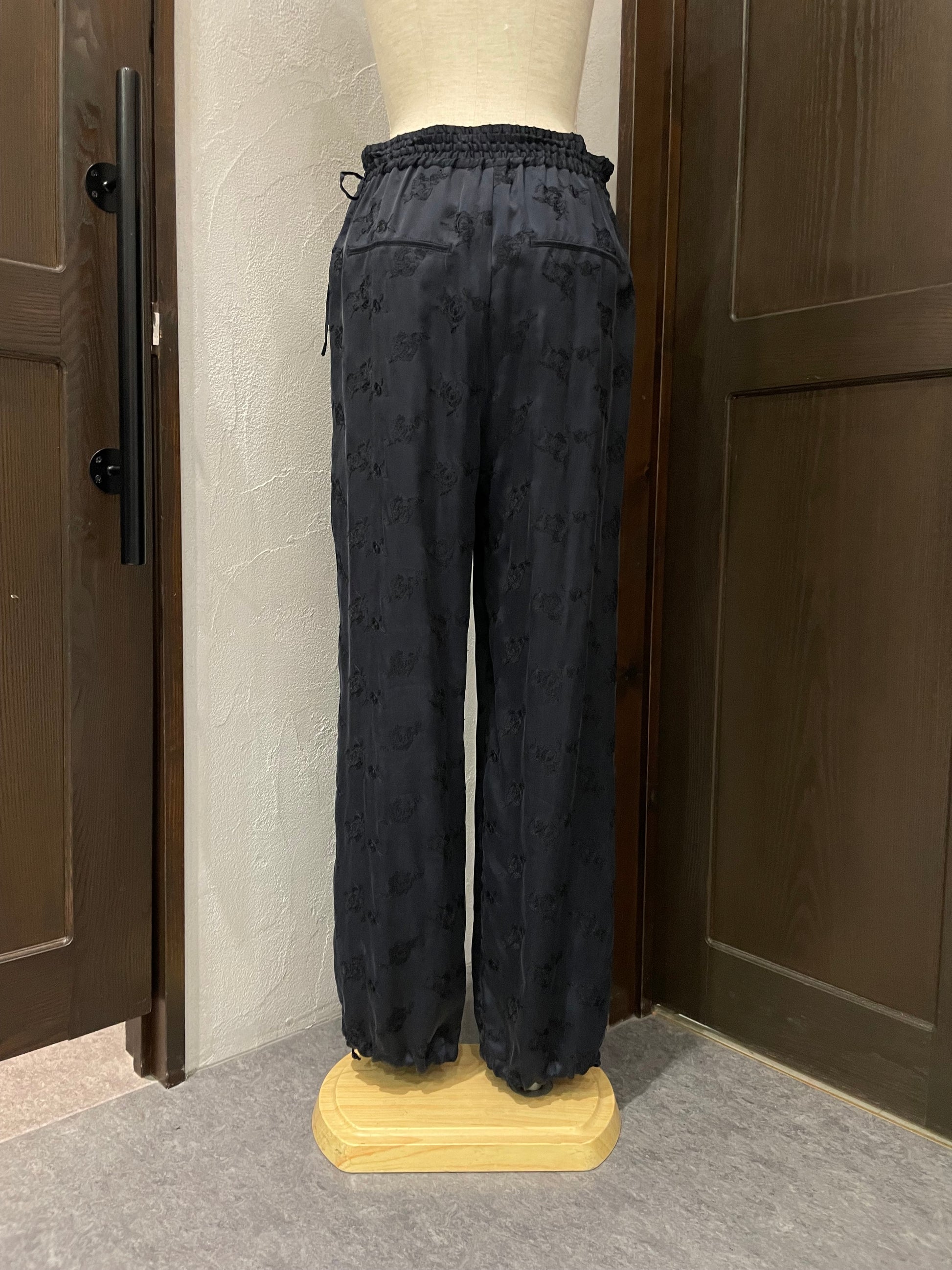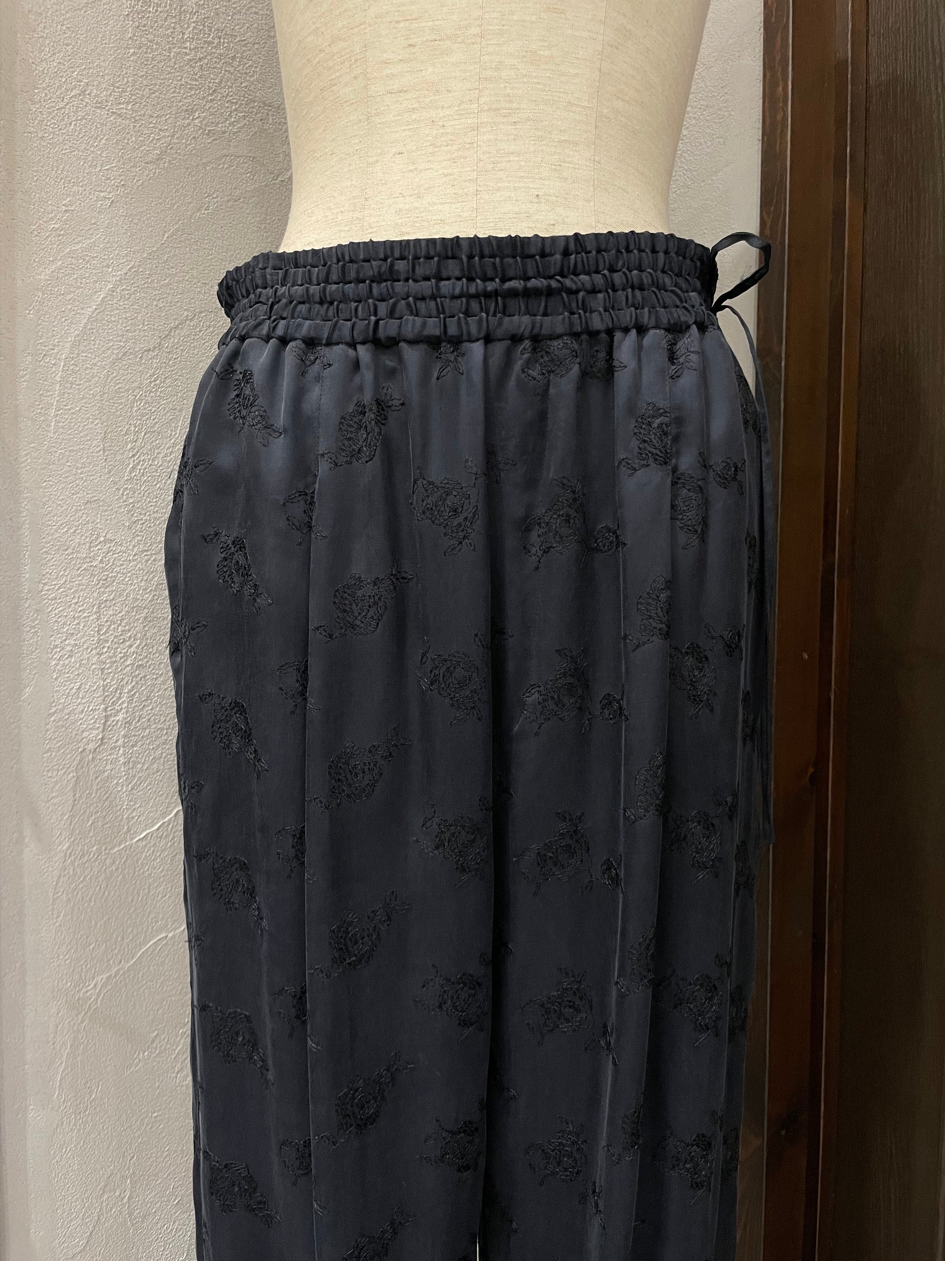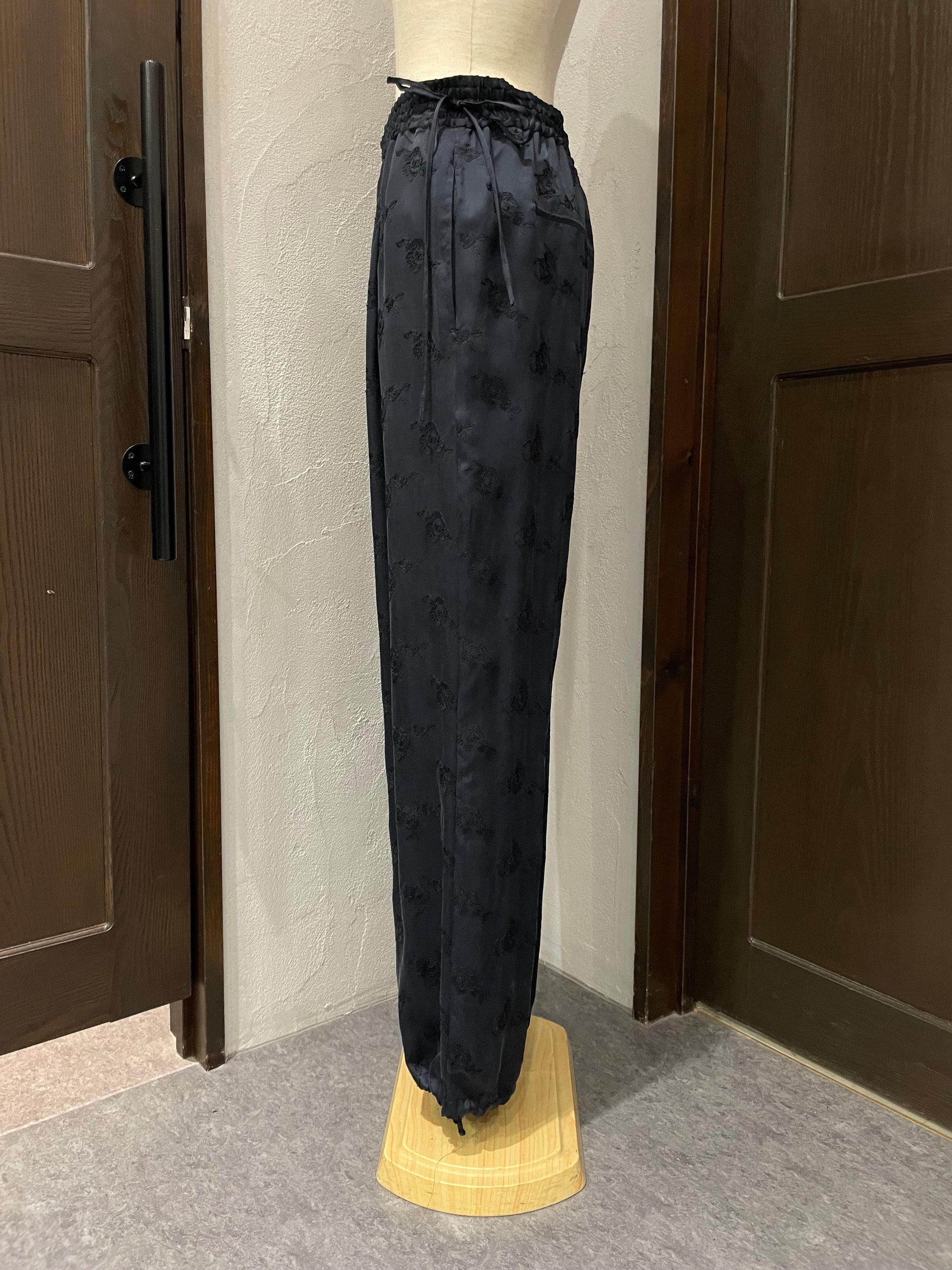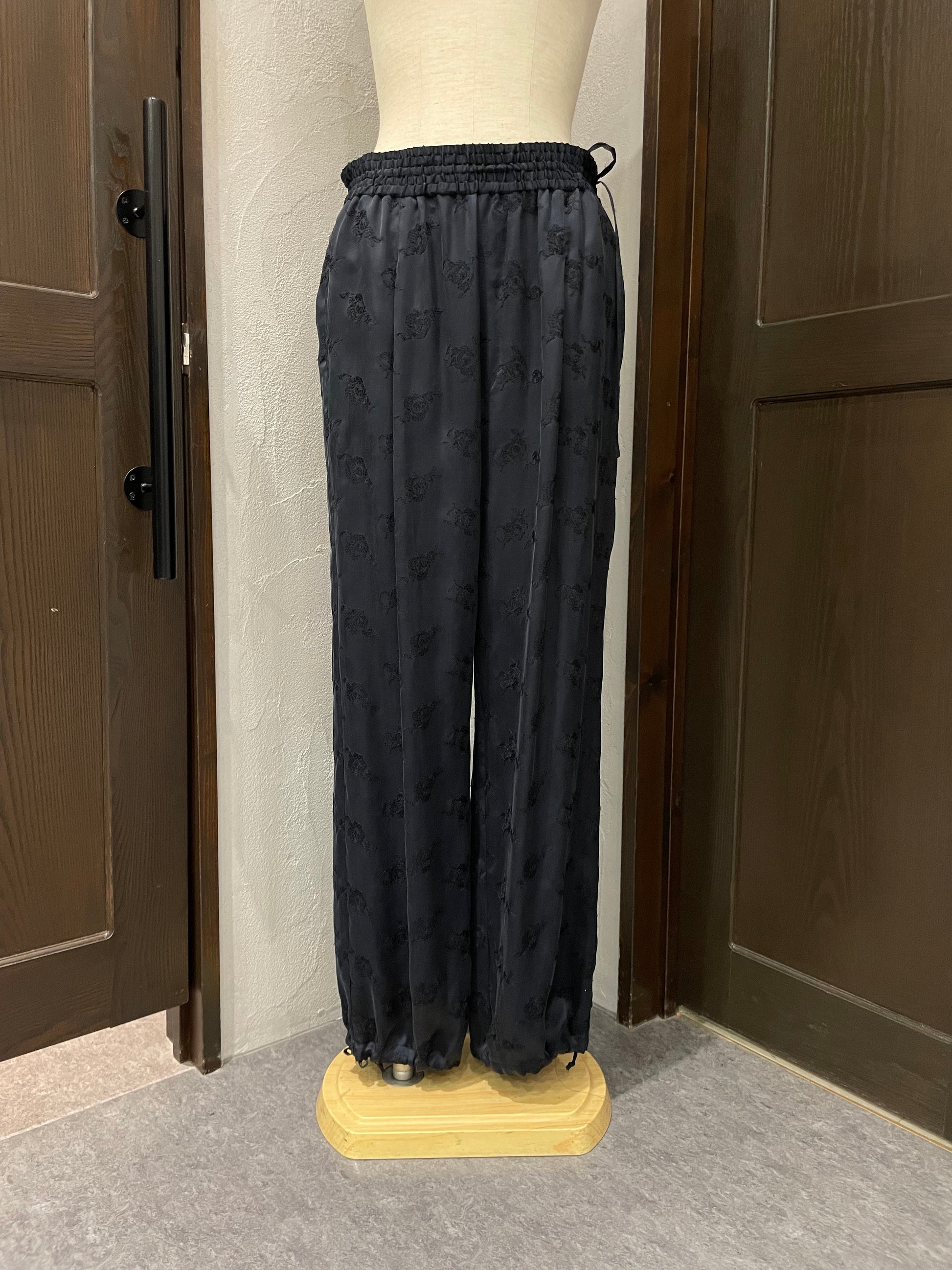 柔らかくとろみのある素材が生むドレープが歩くたびに揺れ、華やかでいて穏やかな空気を纏うようなパンツです。