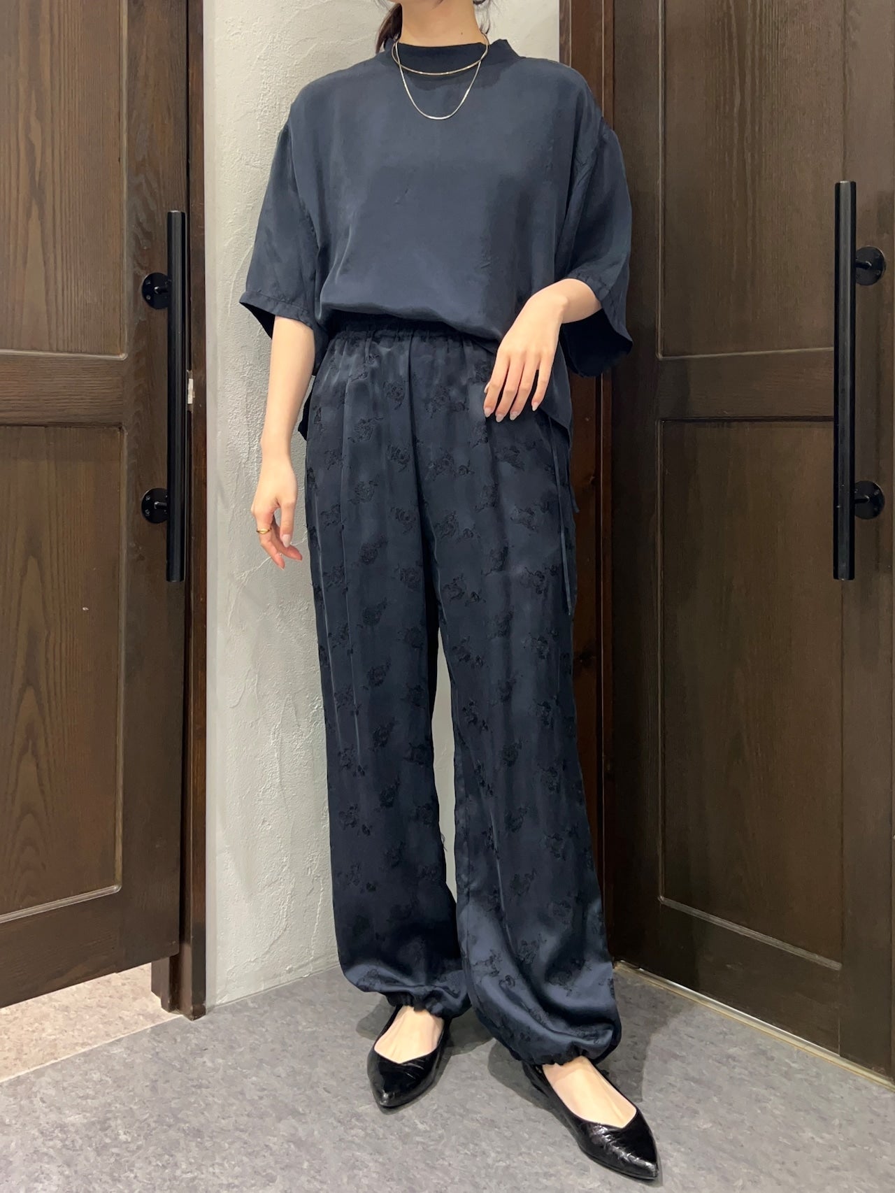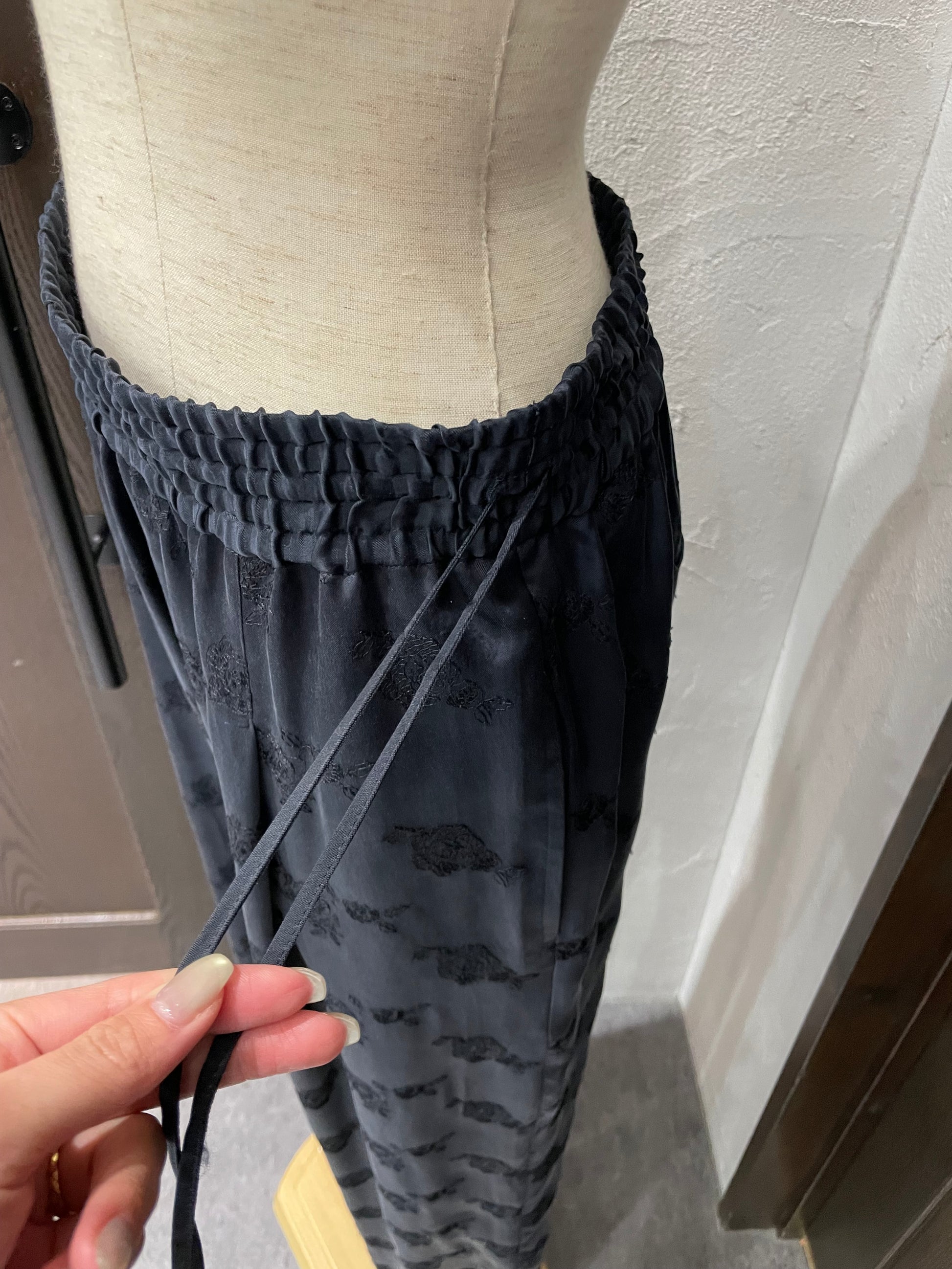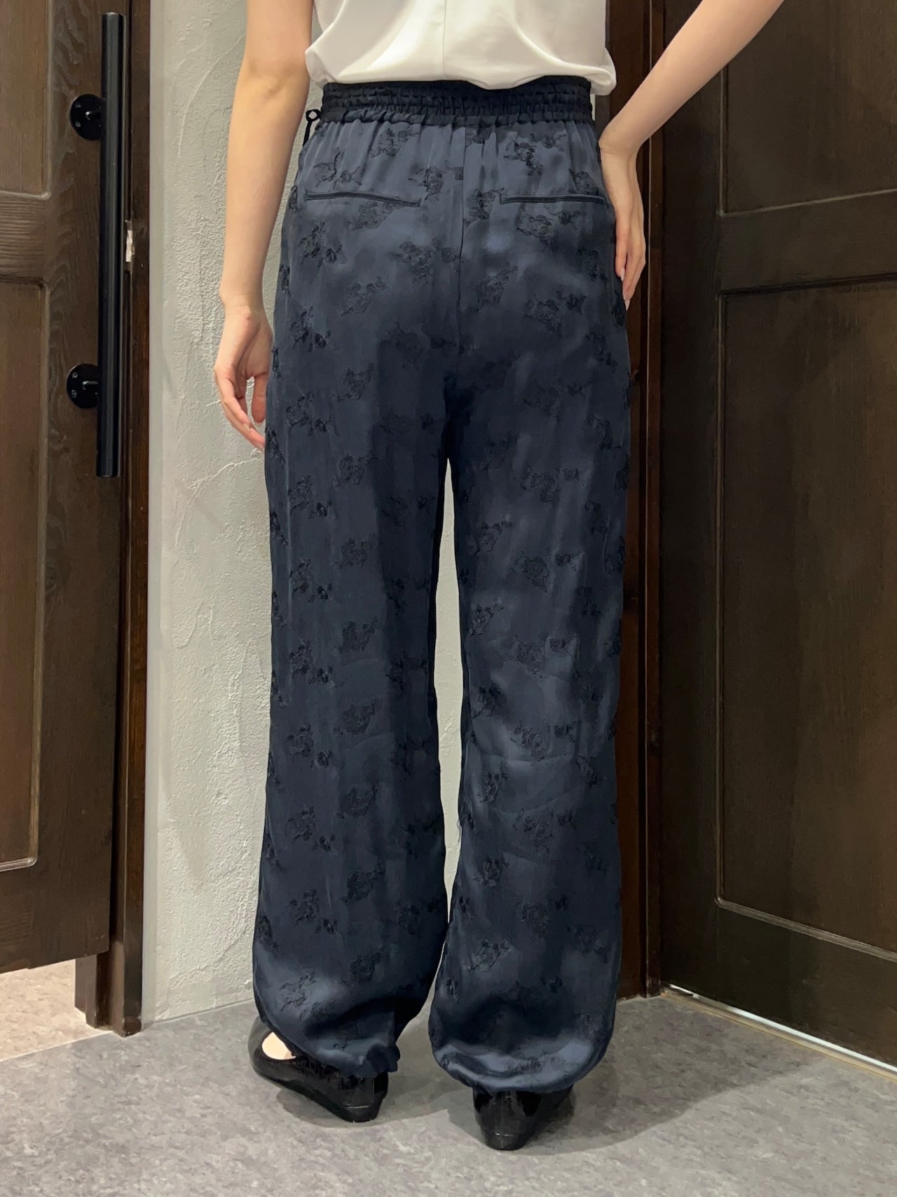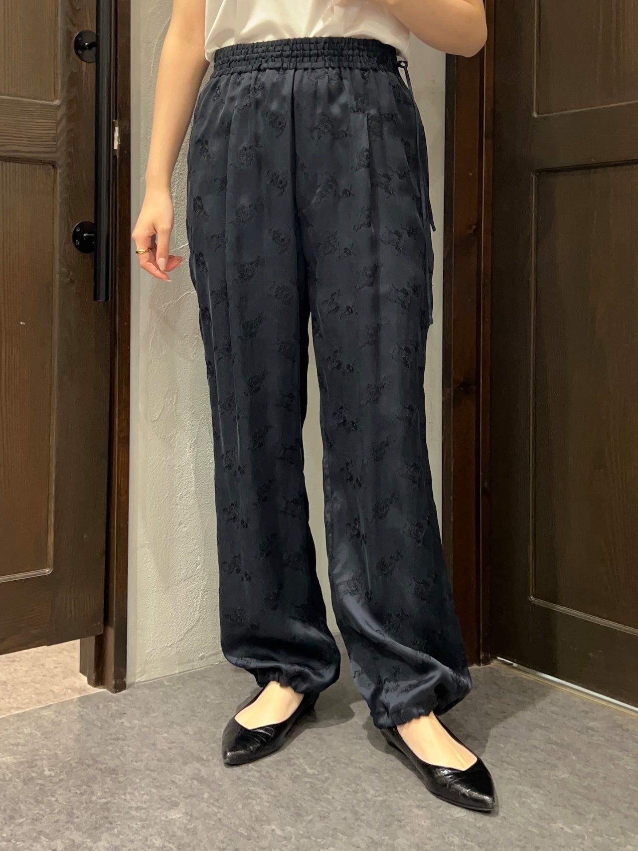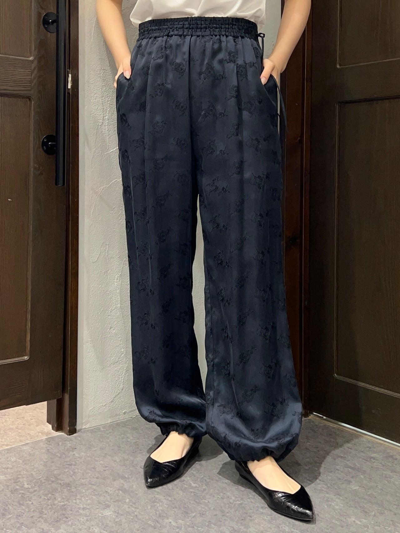 柔らかくとろみのある素材が生むドレープが歩くたびに揺れ、華やかでいて穏やかな空気を纏うようなパンツです。