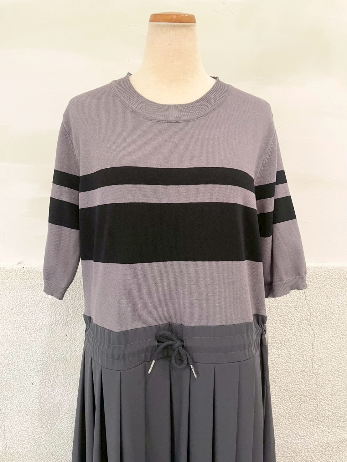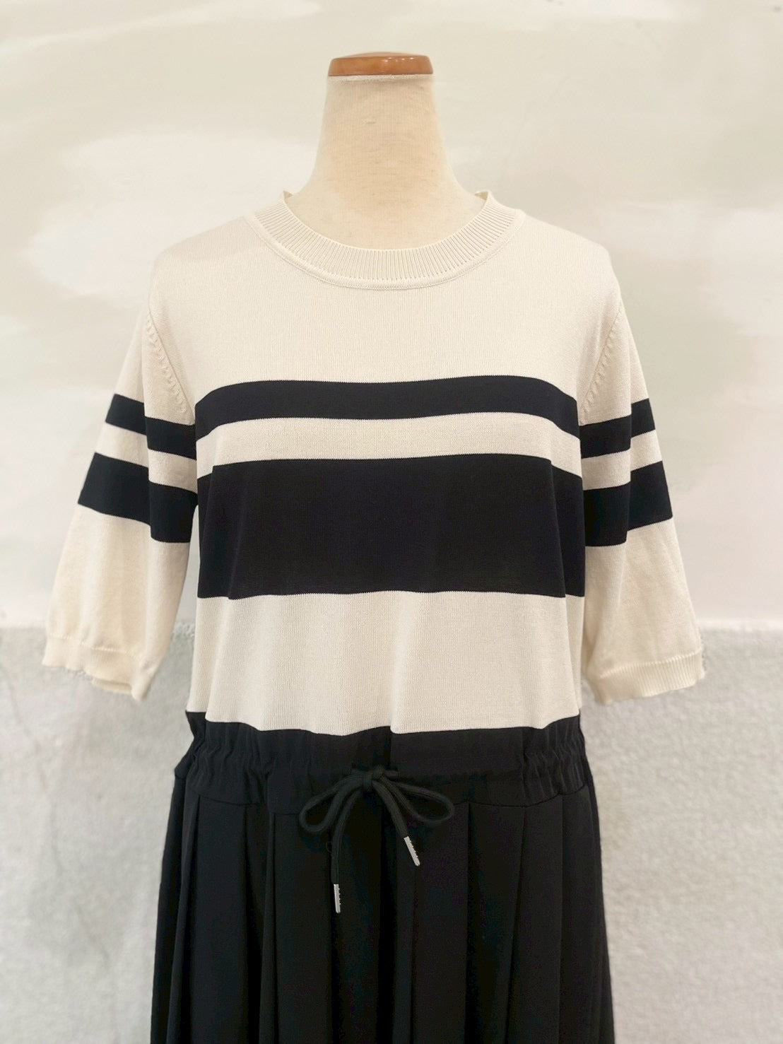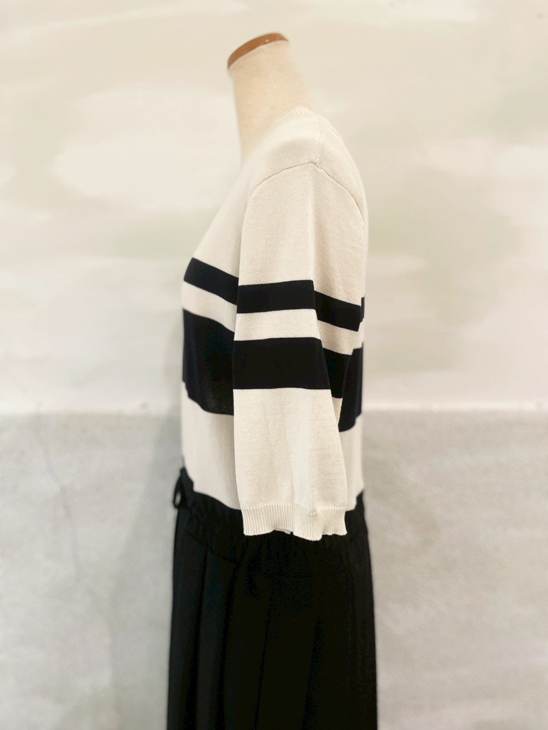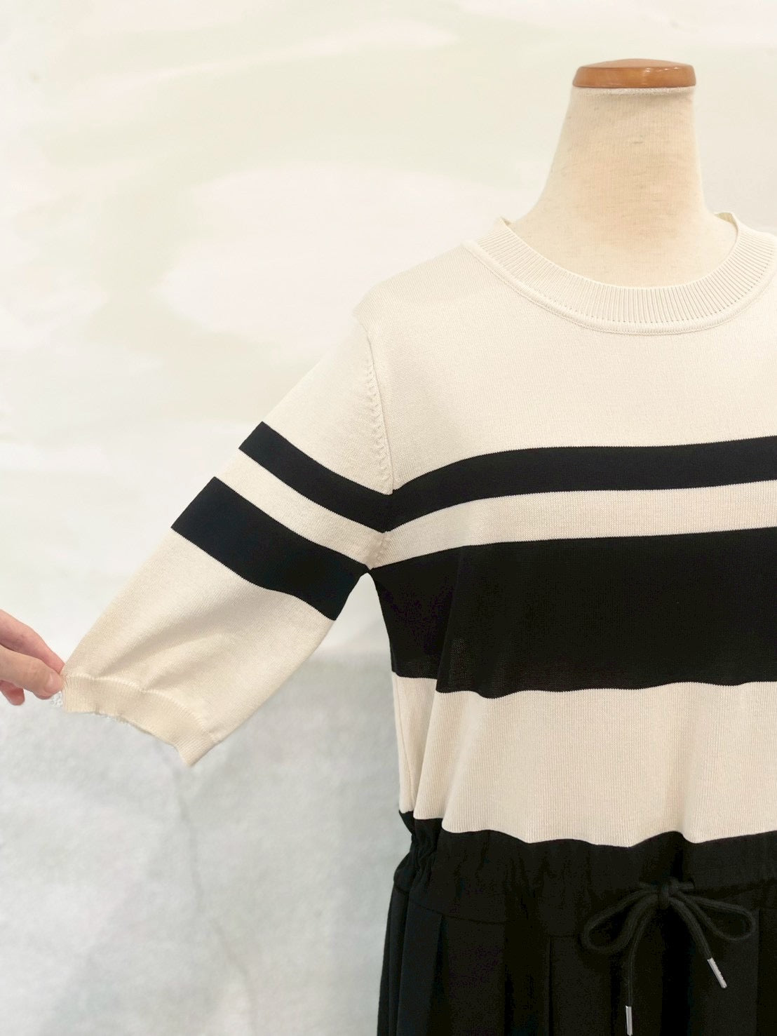心地よい着心地とスタイリッシュなデザインが魅力のbotanical/異素材切替ワンピース。 ニットボーダーと異素材の絶妙な切替に、半袖がリラックス感を演出。シンプルながらも存在感のある一枚です。 ウエスト調節紐付きで、自分好みのシルエットにアレンジできるのも嬉しいポイント。おしゃれに楽しみながら、体型にフィットさせやすいデザインです。 シワになりにくいポリエステルとレーヨン素材を使用しており、お手入れも簡単。デイリーユースにぴったりで、忙しい毎日にも活躍します。 カジュアルからちょっとしたお出かけまで幅広く対応できるこのワンピース、軽やかな印象の着こなしを楽しんでいただけます。