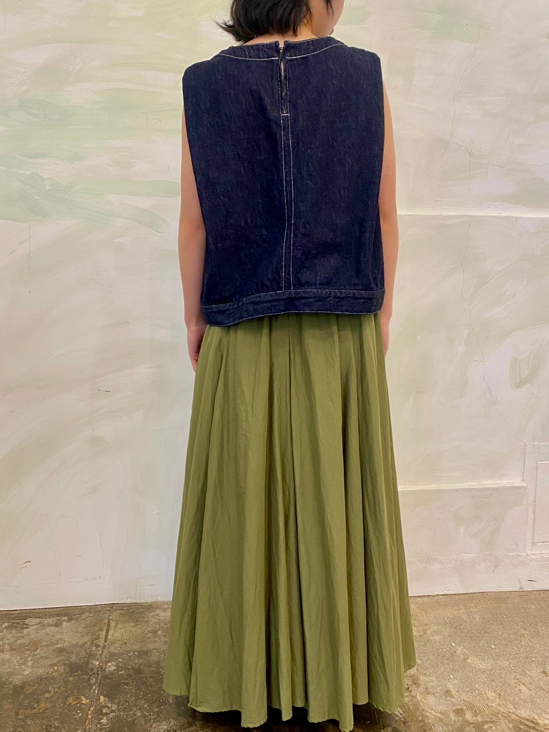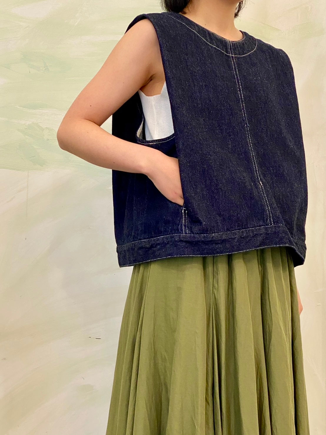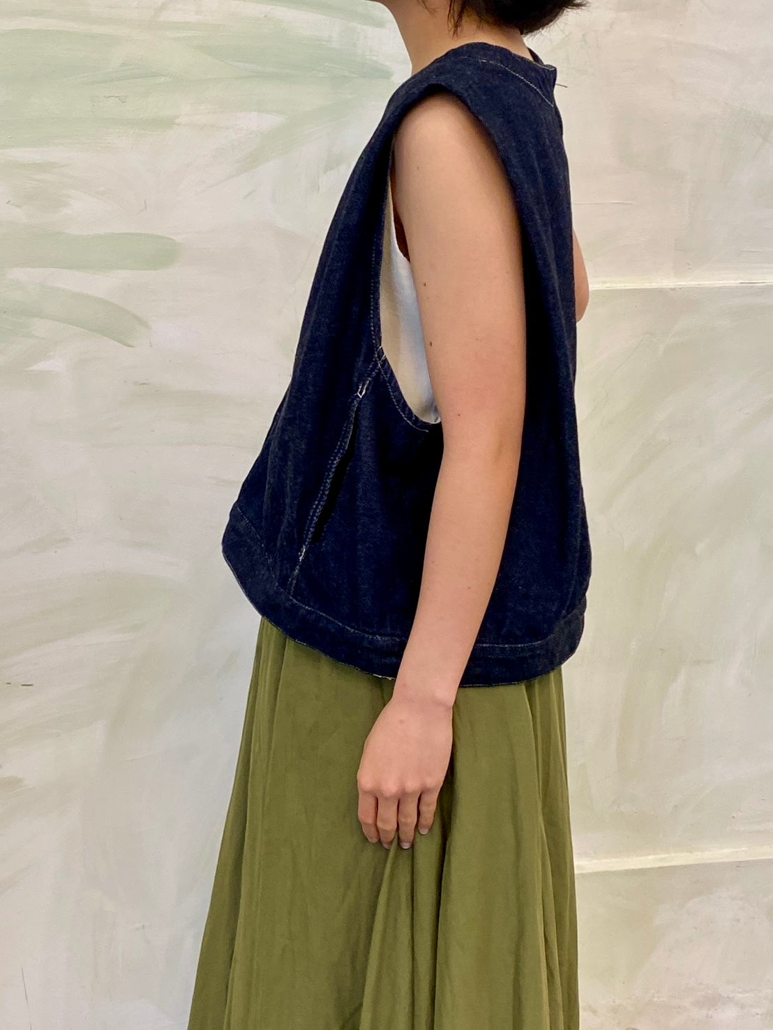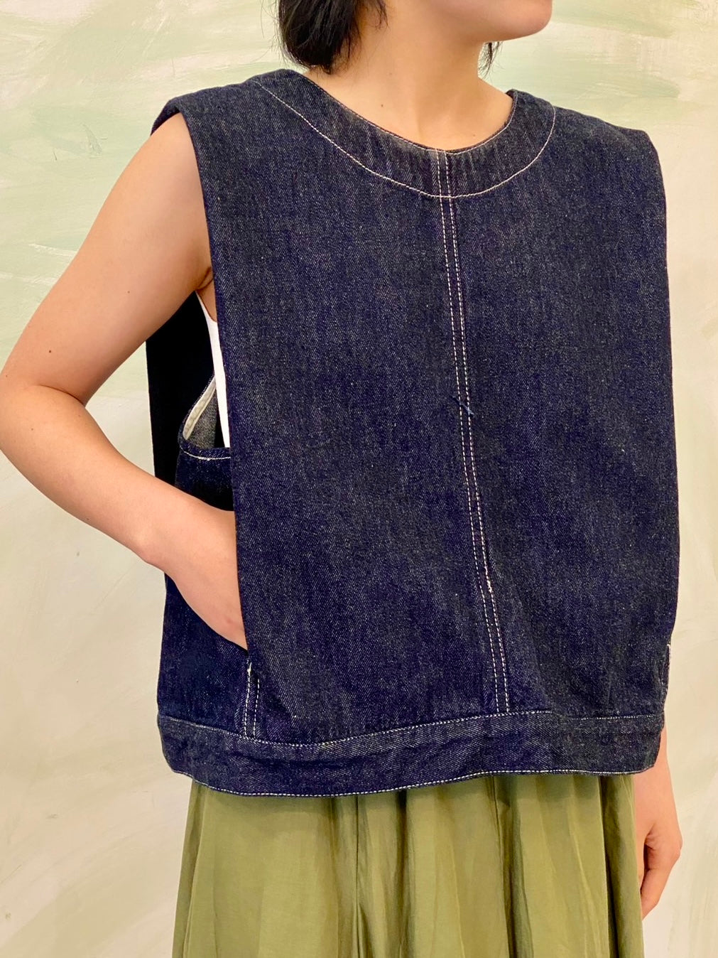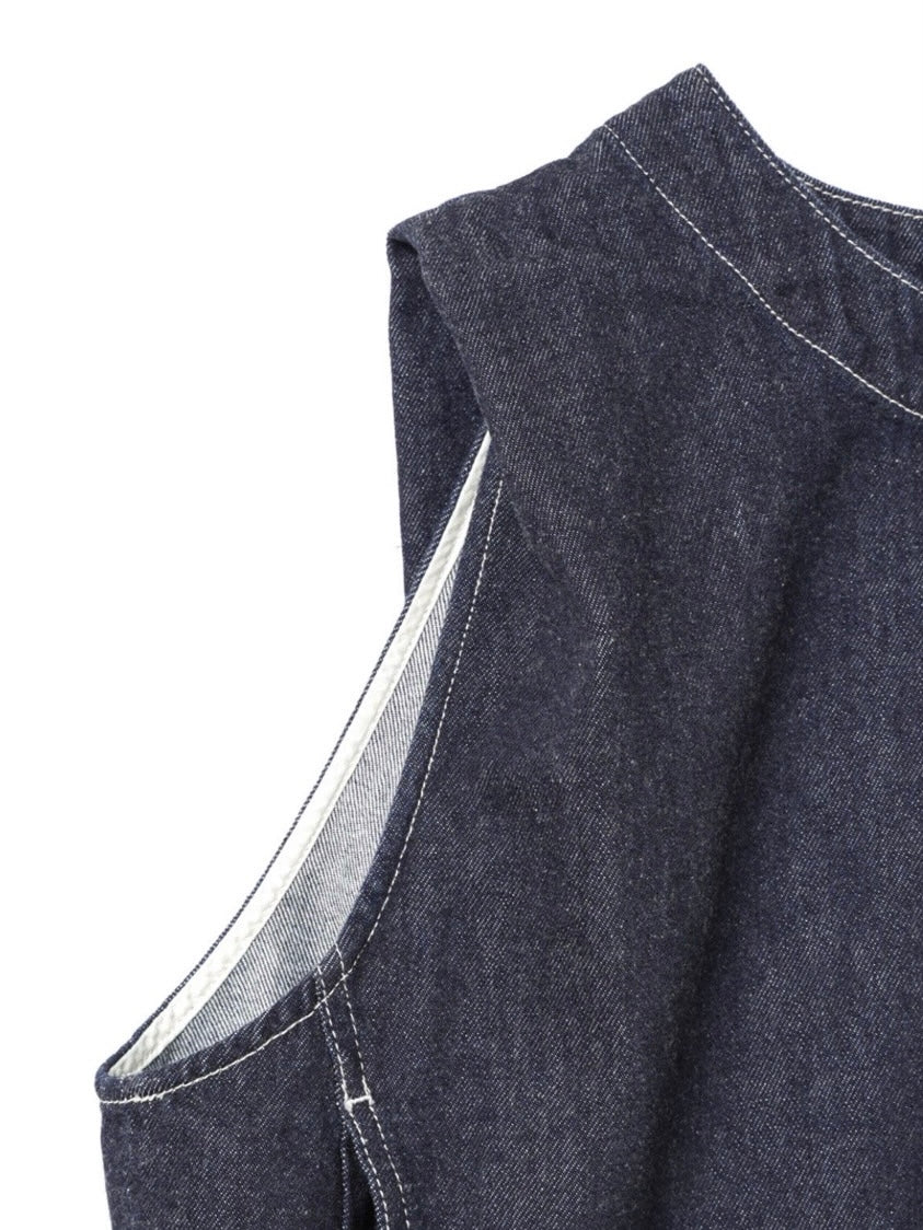 10オンスのデニムを使用した程よい厚みと柔らかさが特徴のデニムベスト(ONEWASH)です。アームと身頃幅が広く袖を通しやすく重ね着のしやすいデザインがポイント。肩幅生地を中に折り込んだデザインで、肩幅が狭くなるように仕上げたことで立体的なシルエットを表現。すっきりとしたショート丈はサイドにポケット付。身頃をセンターで縫い合わせ、裾幅があることでベストのデザイン性が光った1枚。バックネックにはジップが付いているので着脱しやすいデザインに仕上がっています。ワンウォッシュはベーシックに重ね着を楽しんでいただける